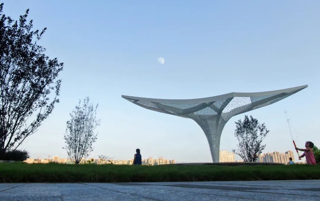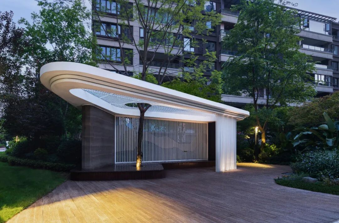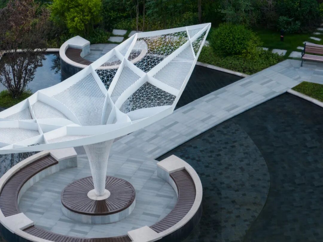 月构架作为项目的精神建筑,围绕主题景观构筑一体化设计,不规则的几何形态,远望形如一处艺术雕塑个性简约,近看花纹错落布置,打造自在轻盈的质感。方案设计阶段,基本确定工艺与材料,施工过程中,不断探讨工艺的精准度与细节。