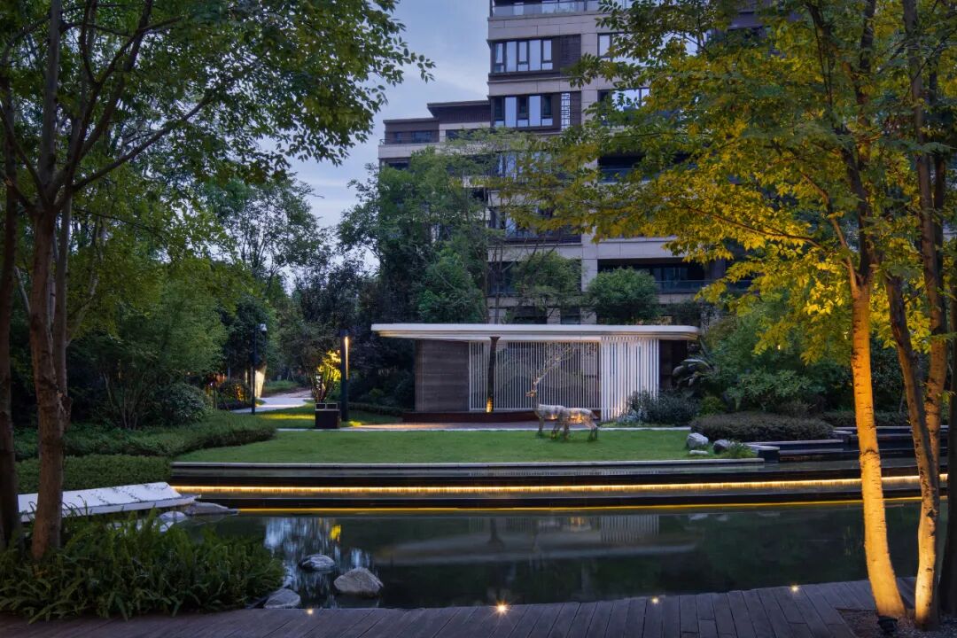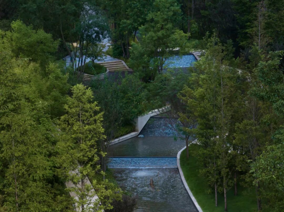 第一幕以嘉陵江源头为起源,通过跌瀑模拟出源头活水流动之感,同时以镜面水池,布置林下客厅、亲水平台、水上汀步等多样化的体验空间,让人感受到林深水雾间隐见麋鹿,留听阁里倾听水声潺潺的生活场景。