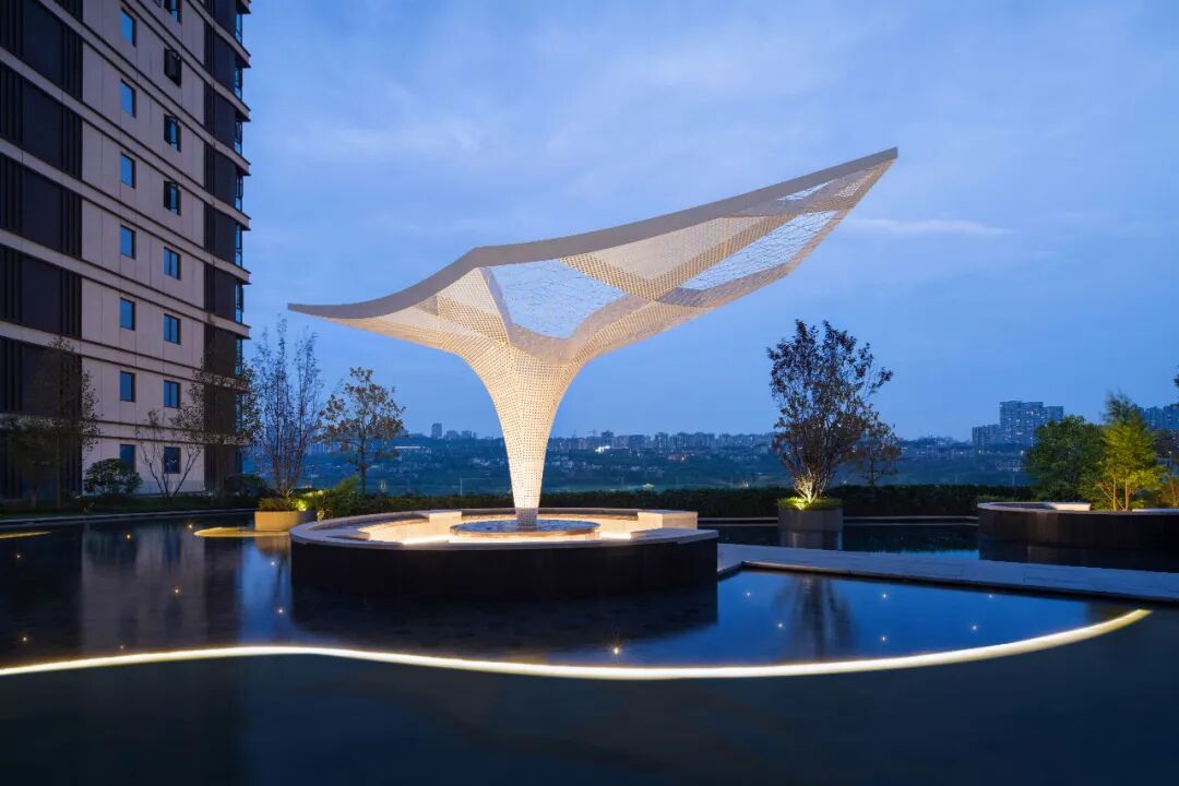 水景是本次项目的施工的重点和难点,大面积的水体运用对施工工艺是一个考验,一是水景的抗渗问题,二是水景防返碱处理,三是水泵水景的循环利用,四是弧形工艺处理问题,五是后期水景维护管理问题等,本项目都将这些问题完美的解决了,并得到了很好的效果呈现