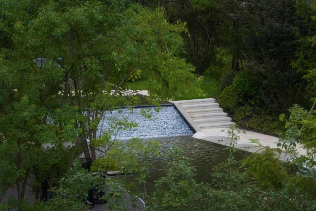 场地利用地形高差形成山谷溪水奔流之势,山令人古,水令人远,石令人静,手法重“置”、轻“叠”,注重跌瀑与石、水、植物、建筑的体量和组合关系,以及对园林工艺的悉心打磨。其跌瀑也寓意人生哲理,使人们在环境中感受到积极澎湃的精神动力。