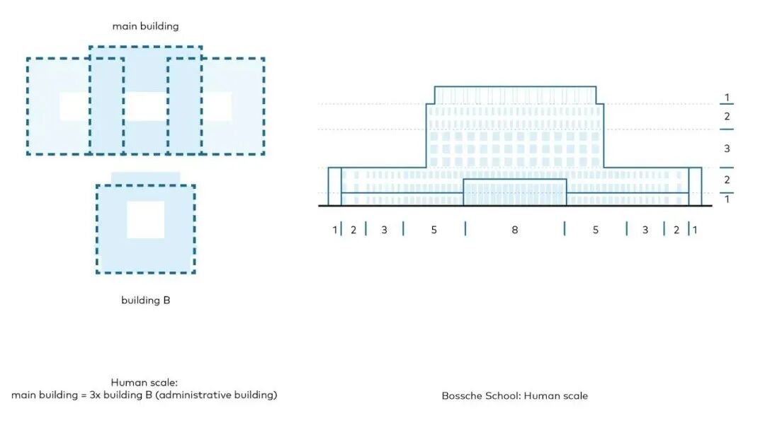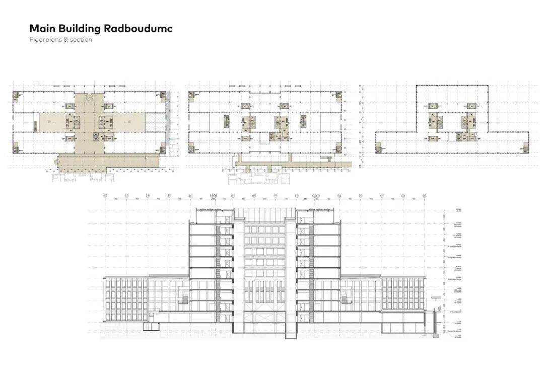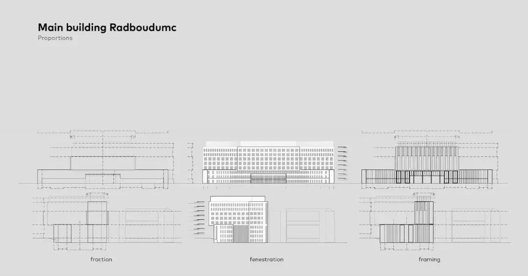 支持和刺激的建筑。新主楼的建筑是对Bossche学校风格的现代诠释,其中明确体现了拉德布德姆的独特品质:人文主义、人的尺度、与自然的联系以及地方的 "特征"(couleur locale)。熟悉和真实的建筑形式支持了拉德布德姆的身份,并与校园内现有的纪念性建筑--博舍学校风格--和谐地融合在一起。克制的设计是基于从黄金分割中得出的理想尺寸。虽然有些楼层有一个足球场那么大,但他们从来没有感觉到巨大,而是平静和熟悉。尺寸设计、清晰的空间构成和流通性有效地促进了医疗机构和病人的福祉和健康。