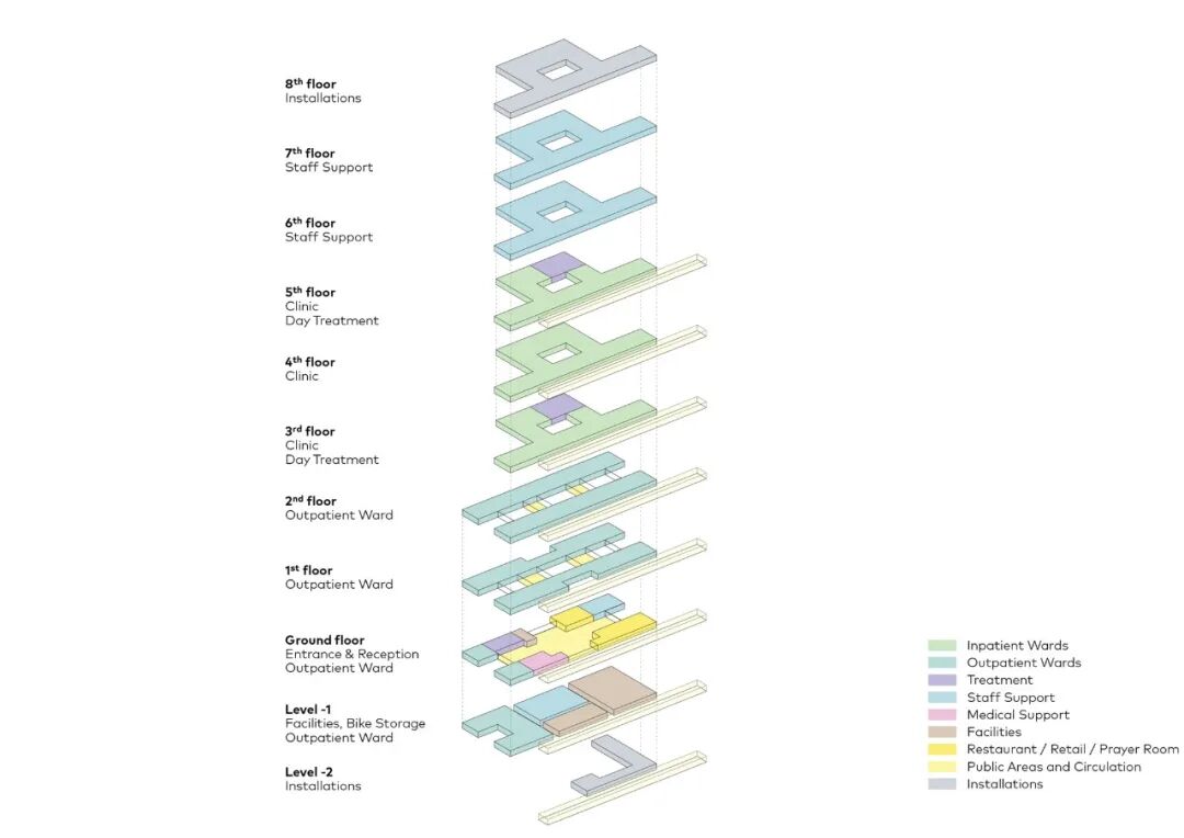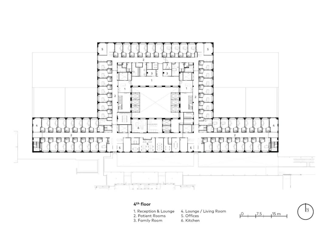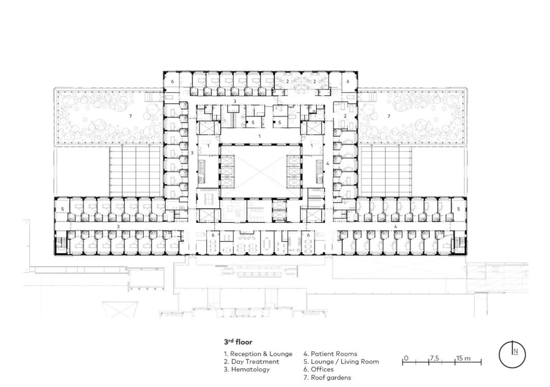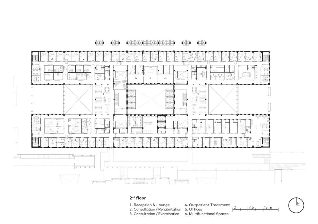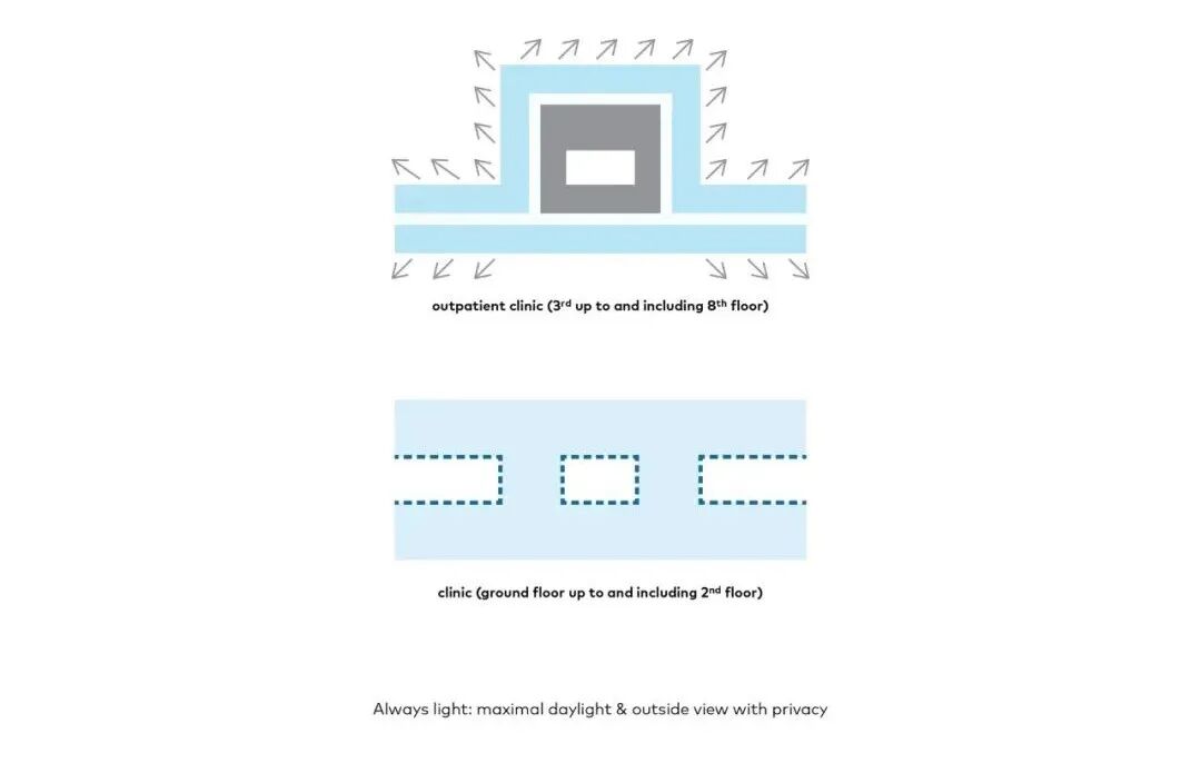 主楼布局清晰,服务和物流的空间被战略性地放置,巧妙地适应视听点,以及综合技术创新,为各种专业提供了必要的自由布局。这种独特的、适应性强的能力构成了建筑的愉快、可持续和持久使用的基础。它也确保了来自不同专业的专家感到受欢迎和舒适。而这也使建筑使用者在现在和将来都能提供和接受个性化的创新护理。
