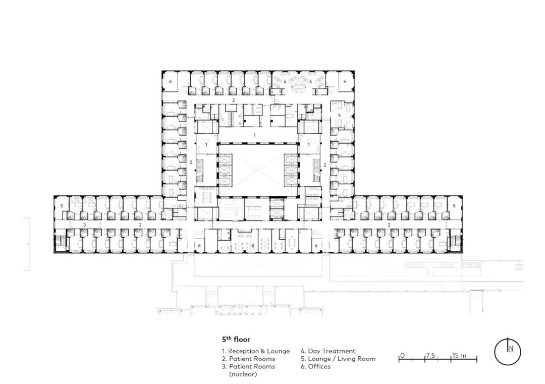 在一个屋檐下进行专业合作。主楼里有警察诊所、护理单位和员工部门,以及神经科、耳鼻喉科、眼科和内科等中心。所有这些专科以前都被安置在不同的大楼里。位于一楼的是主要的接待和准备区。宽敞的诊室和检查室的建造方式使得它们可以被多个专业所使用。护理单元包含150多个单间,有大窗户和私人卫生设施。每个房间还包含有伴侣或护理人员可以在此过夜的空间。房间被设计成各种使用形式,反映了病人康复的各个阶段。它得到了智能医院系统的支持,使房间可以根据病人的意愿进行调整。每个部门的布局都鼓励人们多做运动,可以沿着走廊散步,或者去中央休息室、某个小客厅或无障碍屋顶花园。