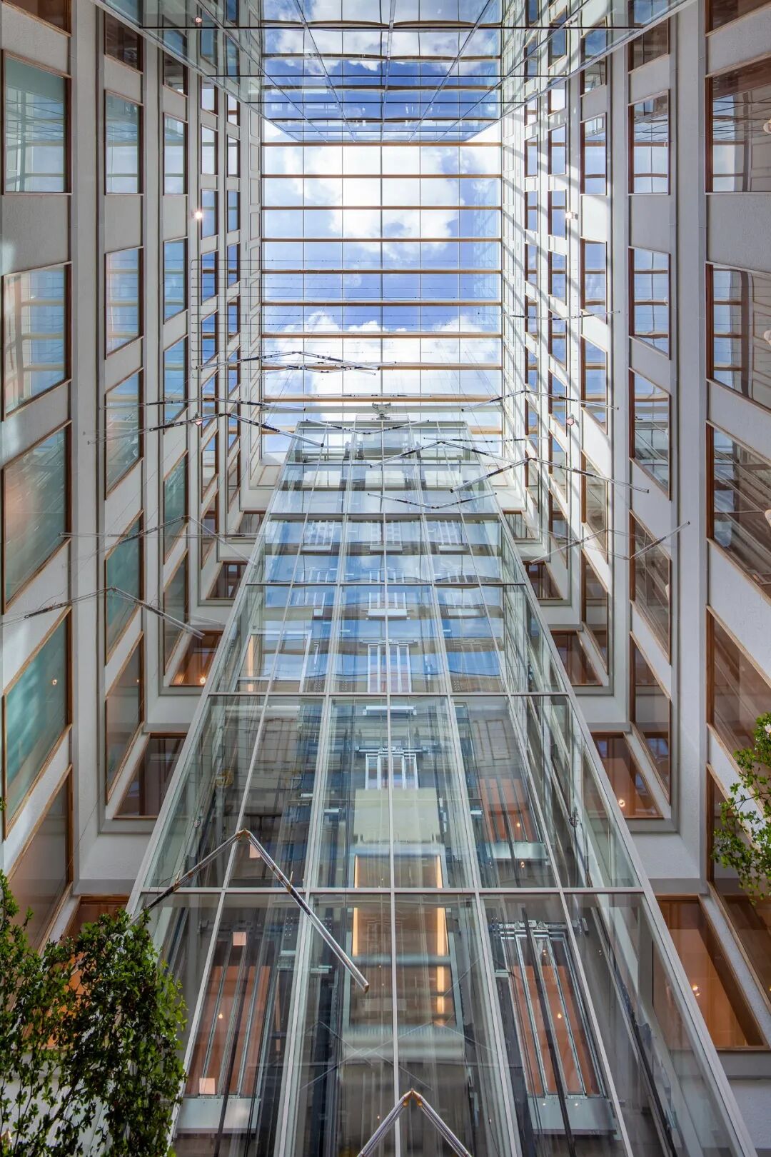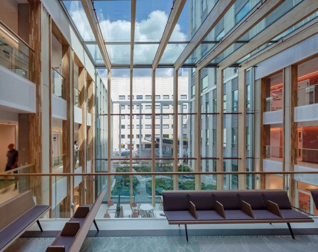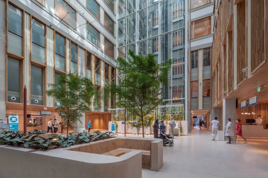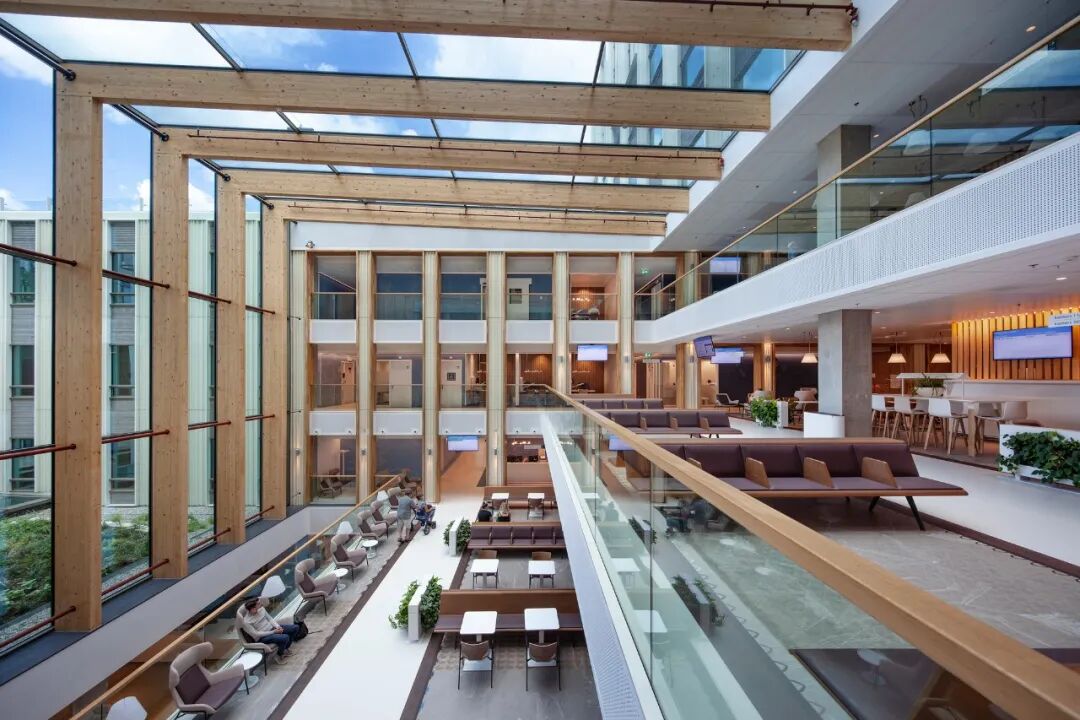 永远明亮,永远有风景。充足的日光、随处可见的庭院花园景观和醒目的景色使每个空间都令人愉悦。在自然光照条件下工作和恢复--整天都是如此--支持生物节律,对身体和精神恢复至关重要。七层楼高的中央中庭将日光引入建筑的中心。成熟的树木和绿色植物将自然引入室内。阶梯式门诊、接待区和餐厅位于玻璃幕墙后面,玻璃幕墙顺利地过渡到玻璃屋顶。这使自然界既可见又有形。动态水平的照明在创造一个愉快和健康的室内气候中起着至关重要的作用。