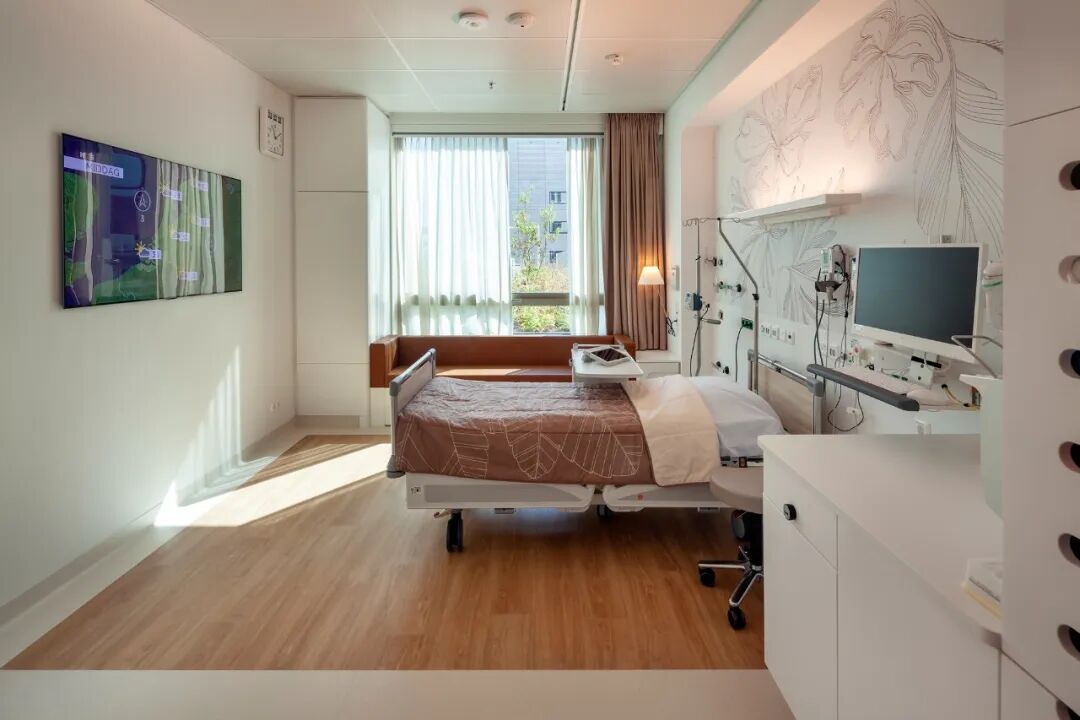 Collaborating specialisms under one roof. The main building houses policlinics, nursing units, and staff departments as well as such centers as Neurology, ENT (ear, nose, and throat), Ophthalmology, and Internal Medicine. All these specialisms were previously housed in separate buildings. Located on the ground floor are the main reception and preparation areas. The spacious consultation and examination rooms are built in such a way that they can be used by multiple specialisms. The nursing units contain more than 150 single rooms with large windows and private sanitary facilities. Each room also contains space where a partner or caregiver can stay the night. The room is designed for various forms of use that reflect the various phases of patient recovery. It is supported by a smart hospital system, which allows the room to be adapted to suit the wishes of the patient. The layout of each department encourages people to exercise more, by walking along corridors or visiting the central lounge, one of the smaller living rooms, or the accessible roof gardens.