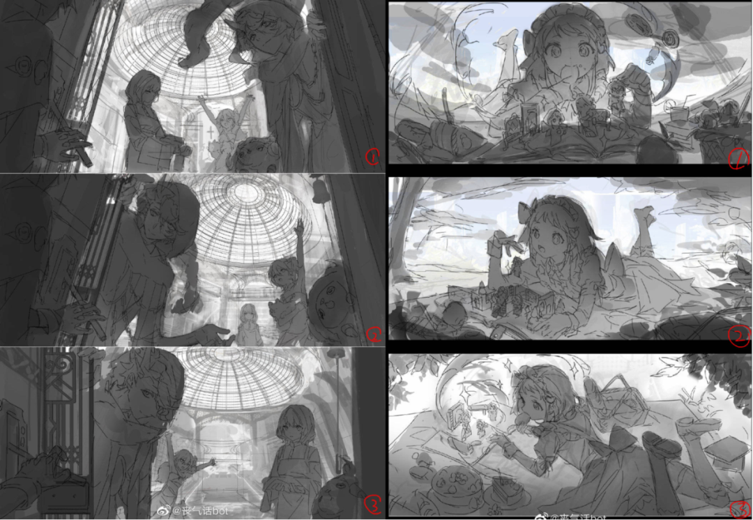 空间上,定好层次关系很重要(这一点我现在也经常做不好,经常因为太灰糊作一团),可以在构图阶段用灰度图来理清思路。