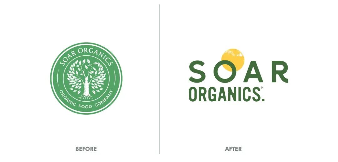 以前的标志具有有机品牌的所有特征,但缺乏对 Soar Organic 的故事如此重要的完整性。我们采用了更实用的字体来传达诚实和透明,并增加了一个句号来强调他们成分的纯度。太阳图标从 "O "中升起,加强了Soar的概念,并创造了积极的能量。