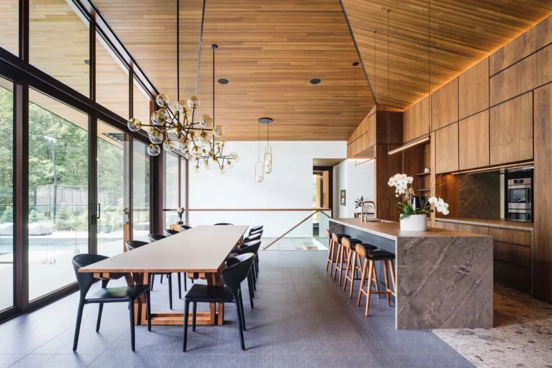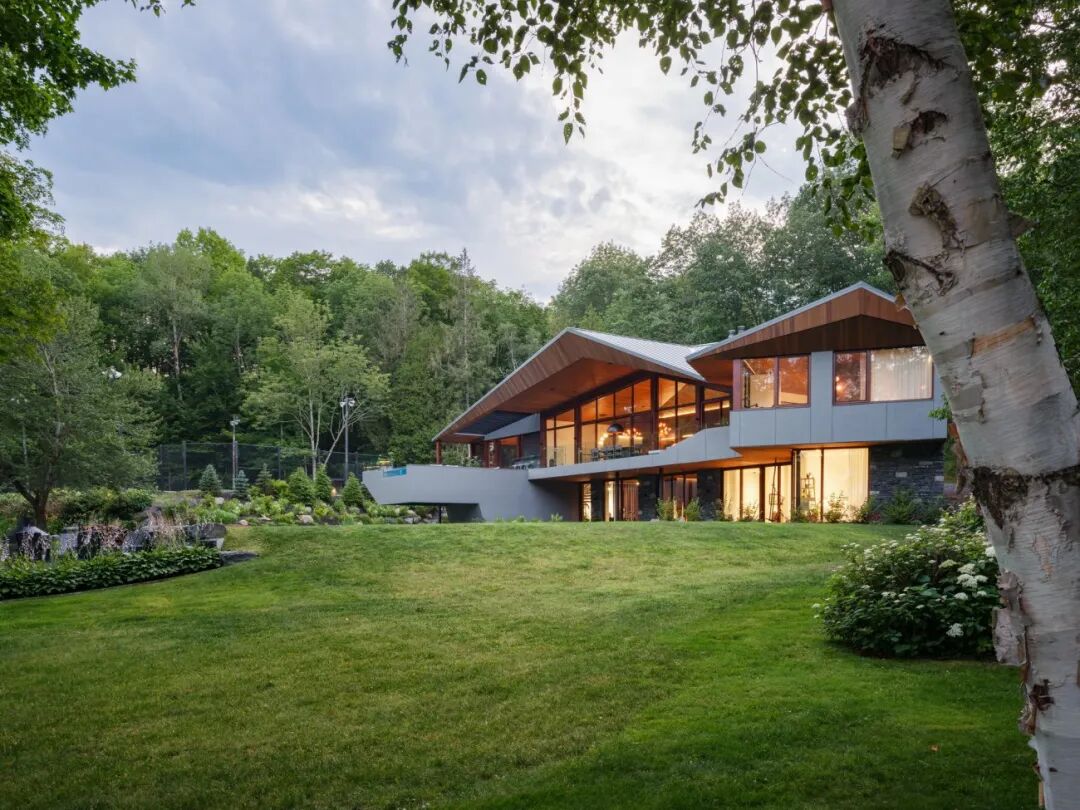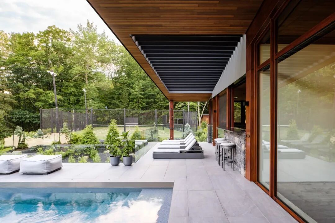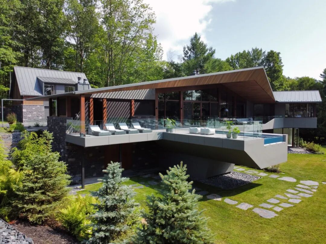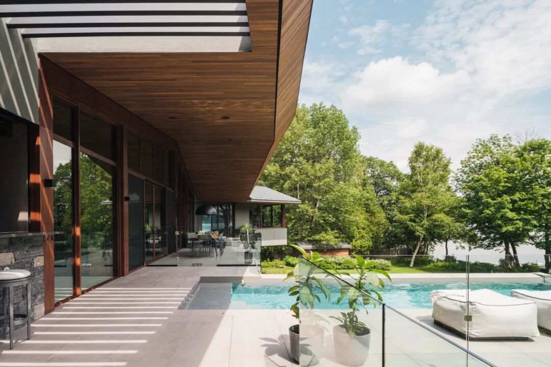 Inspired by a bird’s unfolded wing, the residence’s distinctive, undulating, and architecturally conceived roof follows the volumes of its interior spaces. The interior wooden ceilings comprise a series of triangulations at varying heights - some at twenty-five feet - creating both unique and dynamic spaces. The floor-to-ceiling windows follow these same angles.The harmony and richness of the interior finishes, textures, and materials exude a warm and exclusive feel. The lighting and mechanical systems have been thoughtfully integrated and concealed within the wooden ceilings, becoming virtually invisible. Outside, at its furthest point, the roof projects 14-feet outwards, providing protection against Quebec’s notably harsh winters and warm summers. On the residence’s horizontal axis, a linear terrace extends from one end to the other to connect principal interior spaces, including the main living area and the masters’ quarters, to the common outdoor spaces and infinity pool. The same can be said for the ground level patio. As such, each access point and the indoor and outdoor activities are protected from the elements.The residence’s design program, selection of finishes, textures, and materials, and meticulous detailing allow it to stand out, while harmonizing with its surrounding environment.