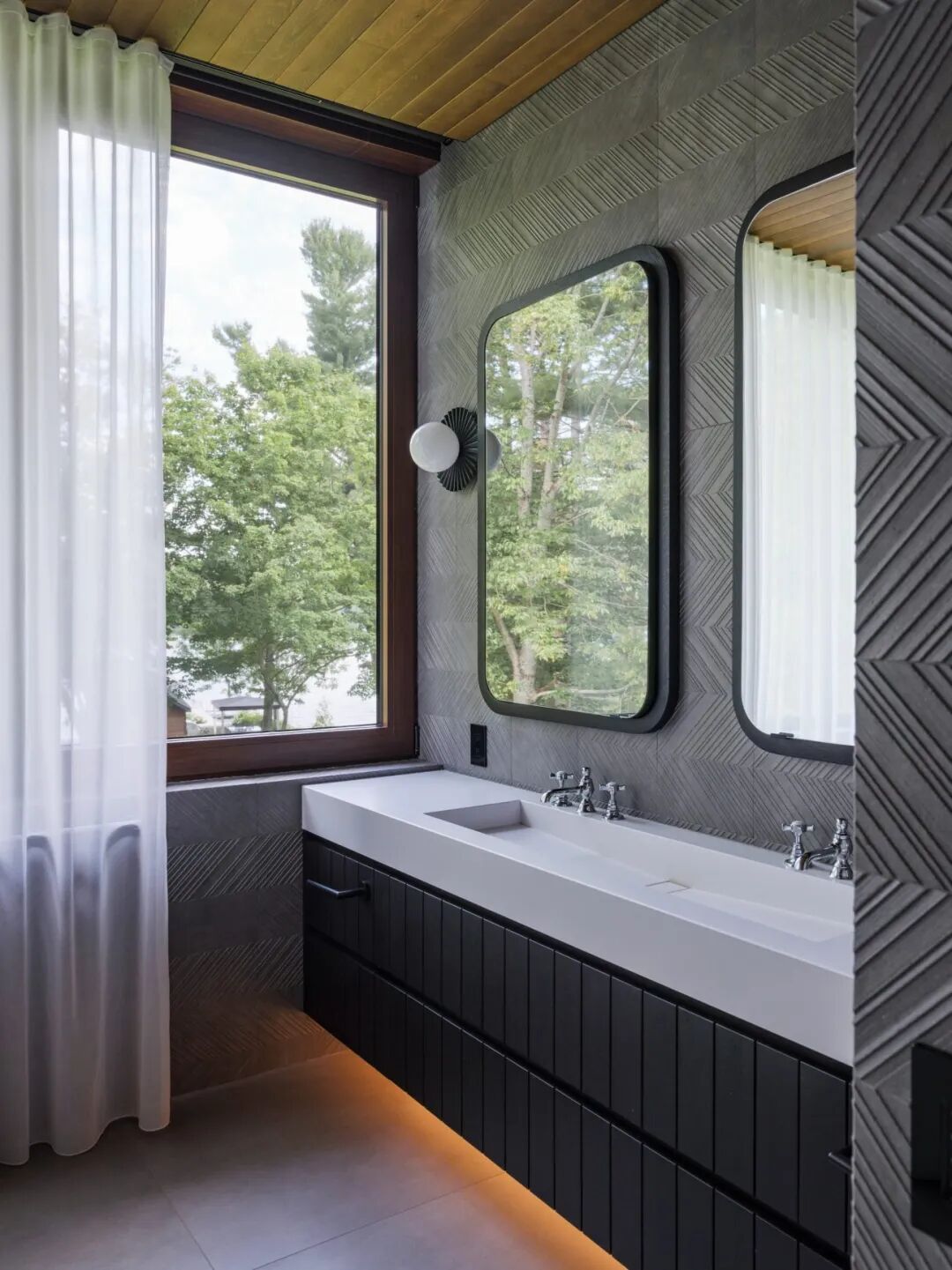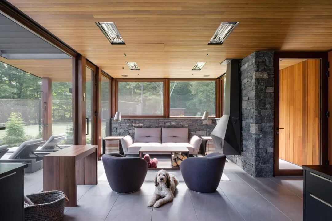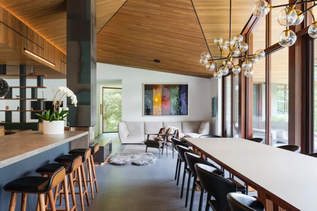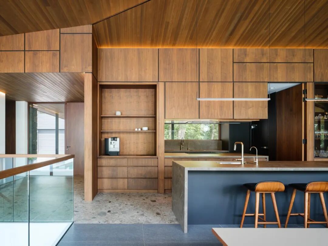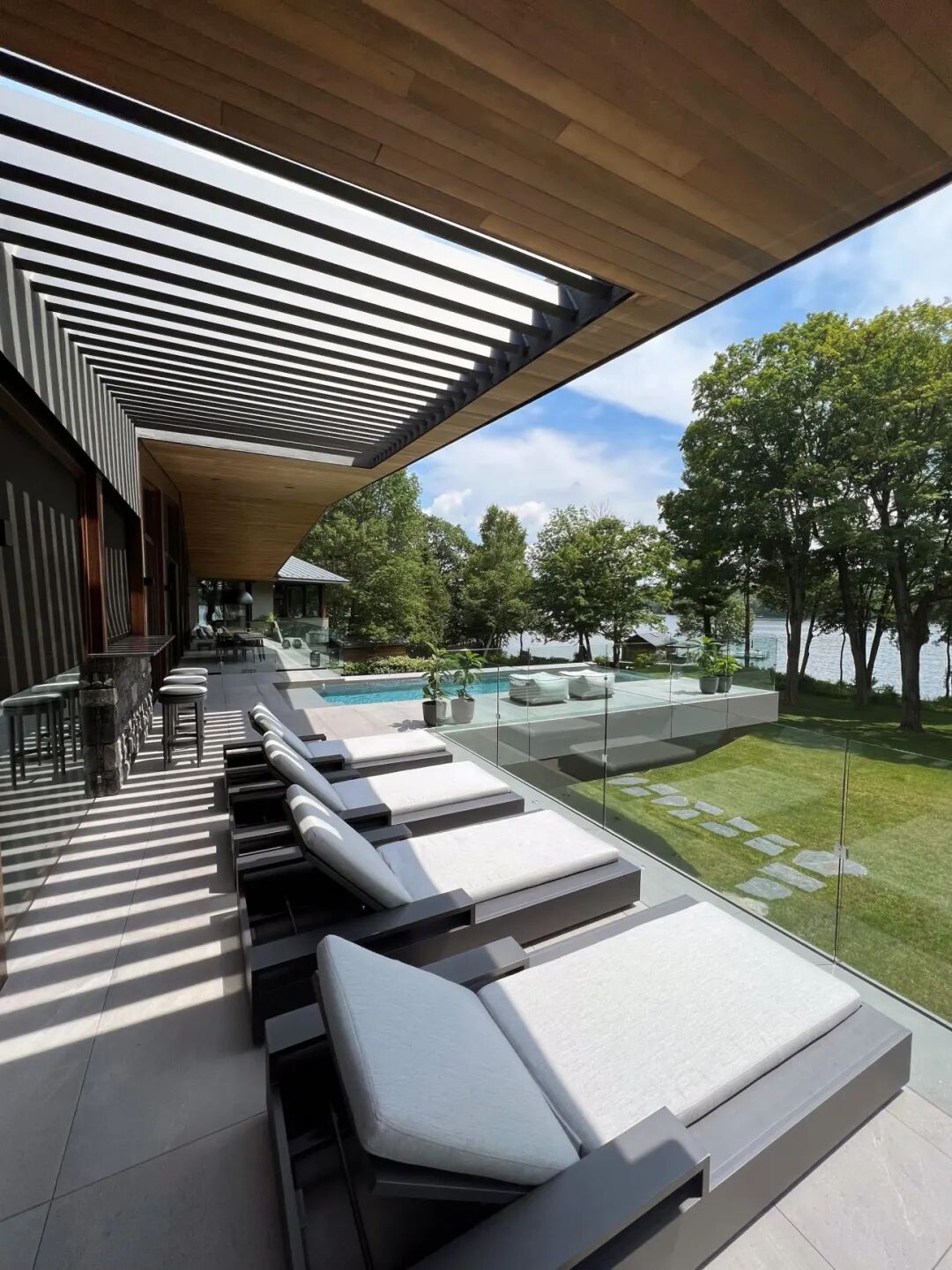 Inspired by a bird’s unfolded wing, the residence’s distinctive, undulating, and architecturally conceived roof follows the volumes of its interior spaces. The interior wooden ceilings comprise a series of triangulations at varying heights - some at twenty-five feet - creating both unique and dynamic spaces. The floor-to-ceiling windows follow these same angles.The harmony and richness of the interior finishes, textures, and materials exude a warm and exclusive feel. The lighting and mechanical systems have been thoughtfully integrated and concealed within the wooden ceilings, becoming virtually invisible. Outside, at its furthest point, the roof projects 14-feet outwards, providing protection against Quebec’s notably harsh winters and warm summers. On the residence’s horizontal axis, a linear terrace extends from one end to the other to connect principal interior spaces, including the main living area and the masters’ quarters, to the common outdoor spaces and infinity pool. The same can be said for the ground level patio. As such, each access point and the indoor and outdoor activities are protected from the elements.The residence’s design program, selection of finishes, textures, and materials, and meticulous detailing allow it to stand out, while harmonizing with its surrounding environment.
