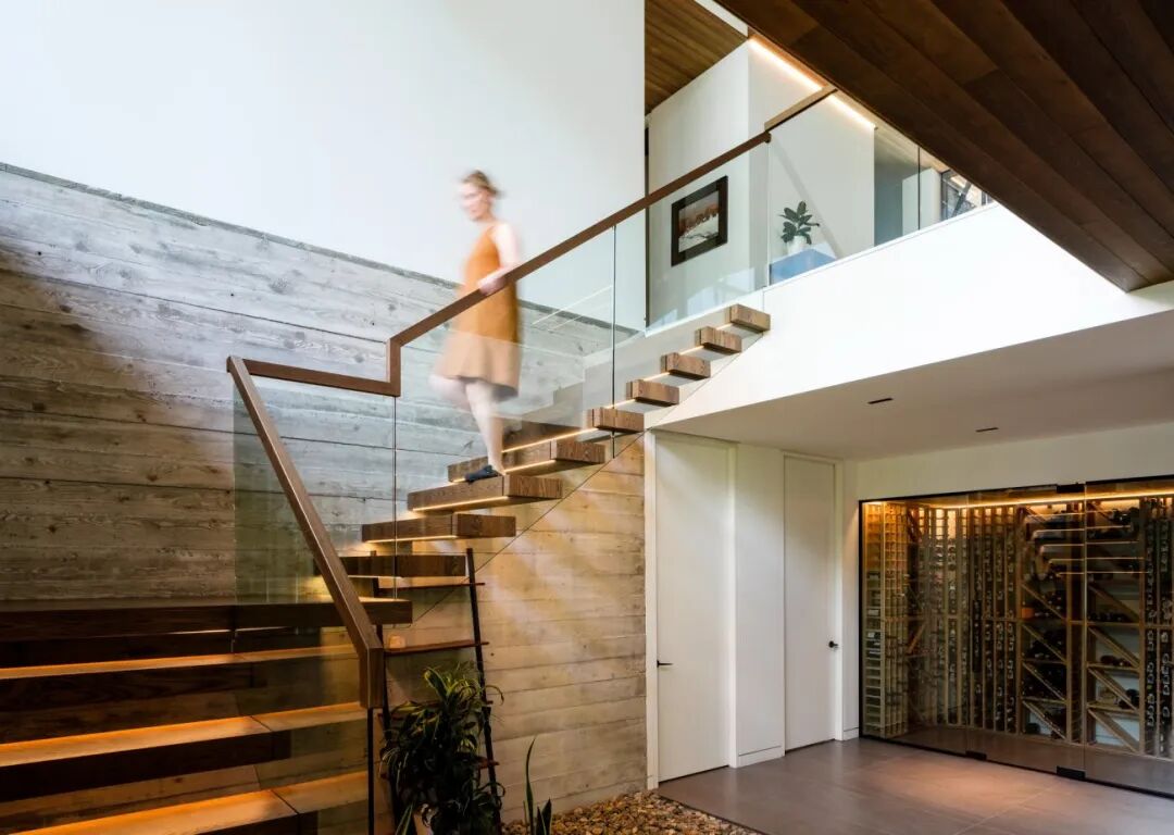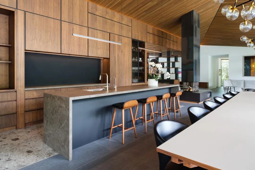 新的6700平方英尺的建筑部分利用了旧宅的占地面积,新的主轴垂直运行,放大了新住宅的外部和内部特征,一个预先存在的车库位于轴线的一端,并通过车库的屋顶结构连接到住宅。进入住宅后,一个由楼梯和落地窗组成的开放空间将客人的注意力引向最终位于轴线另一端的外部无边泳池和远处的海湾。用这种方式链接外部和内部空间非常巧妙,有意识地让人联想到水疗中心,建筑元素能展现出自己的特点,外立面由落地窗之间的巨大体积组成,有助于隐藏住宅的工作间,以确保一定程度的隐私,为居住者提供更大的舒适感。立面的深色天然石材与明亮、宽敞、通风的内部空间也形成了强烈对比。