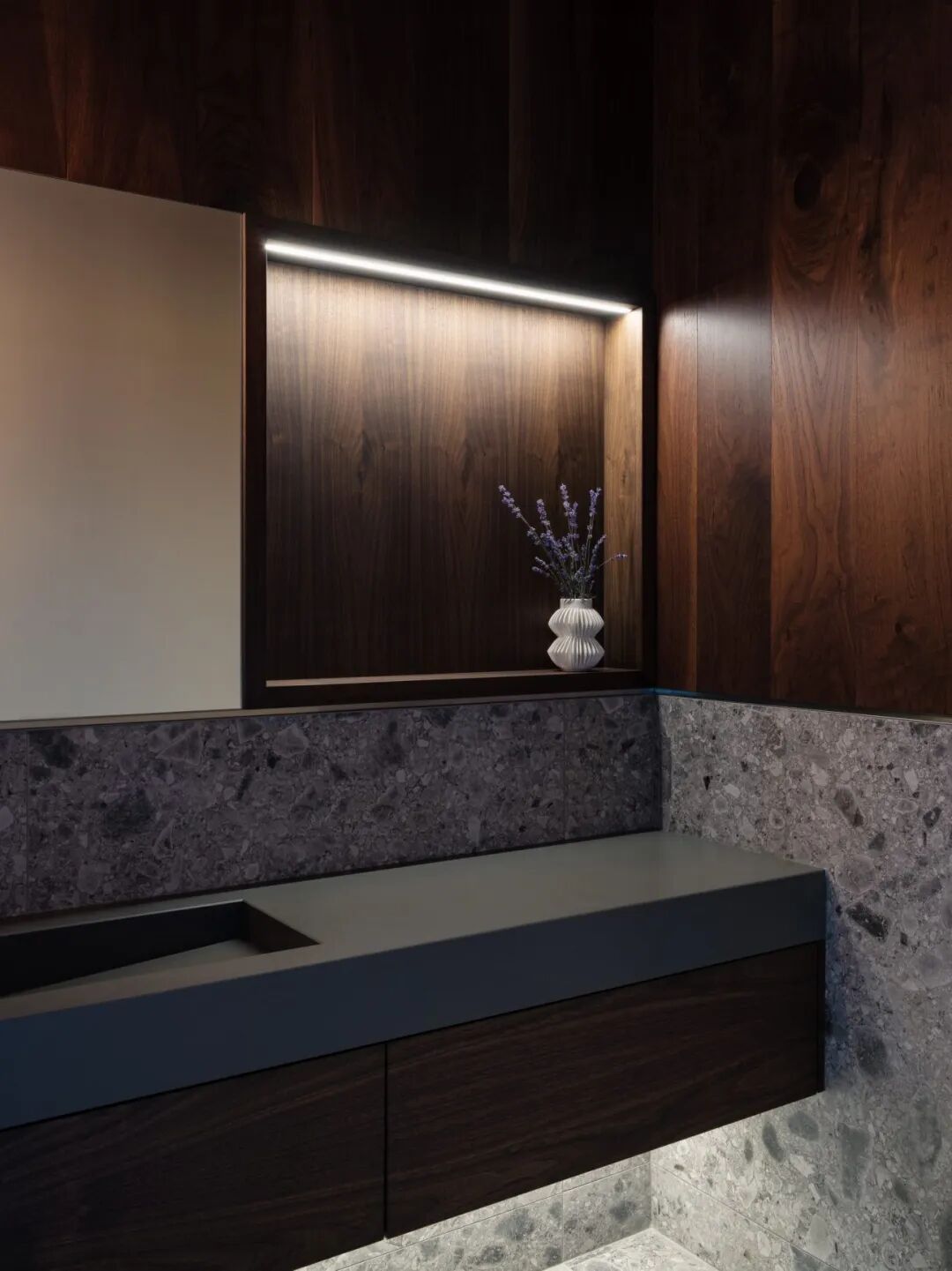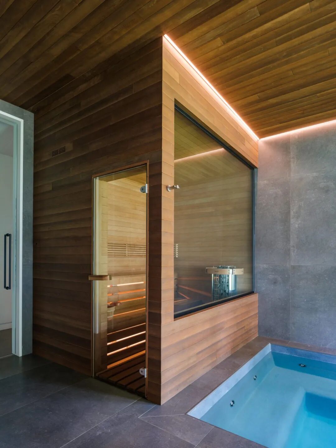 The kitchen’s design accommodates daily family needs, yet it is also suited to a chef and an accompanying culinary team in the case of catered events and parties. By means of a concealed door and a built-in curtain, the service kitchen can be separated from the rest of the residence. Walnut panels enclose a volume comprising a kitchen, a dinette, a library, and half of a double living room. The warmth and richness of the wood complements the stone and steel of the central fireplace.Designed to accommodate up to twenty-four people, the custom-made dining room table is a feature piece, running parallel to the kitchen island and floor-to-ceiling windows, and offering impressive views of the bay.The main level, in sequential order from left to right, plays host to a veranda, a cloakroom, a powder room, a main living area – with the aforementioned kitchen, a dining room, a double living room, a laundry room, and the masters’ quarters. The ground level, again in order from left to right, plays host to a lounge, a training room, a spa with a dry sauna, a whirlpool bath, and three bedrooms adjacent to two full bathrooms and a playroom.The residence’s horizontal axis separates the technical and mechanical rooms from the primary living areas, allowing the occupants to take advantage of the natural light and exterior views. This design program allows guests to connect with their surrounding environment, while providing user comfort and spatial fluidity. This same axis, which follows the angles dictated by the natural topography of the site, creates a protected courtyard in which most of the outdoor activities are concentrated.