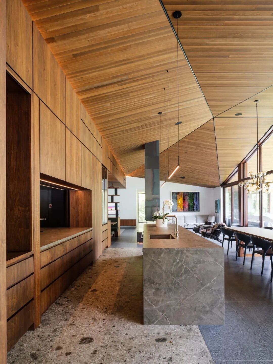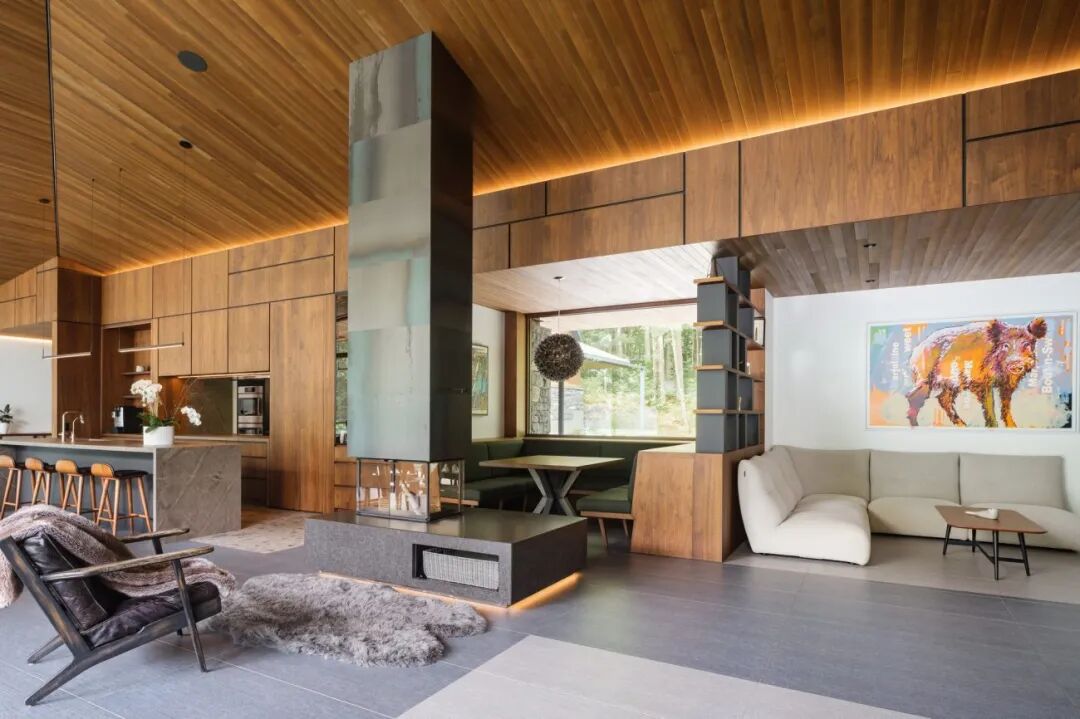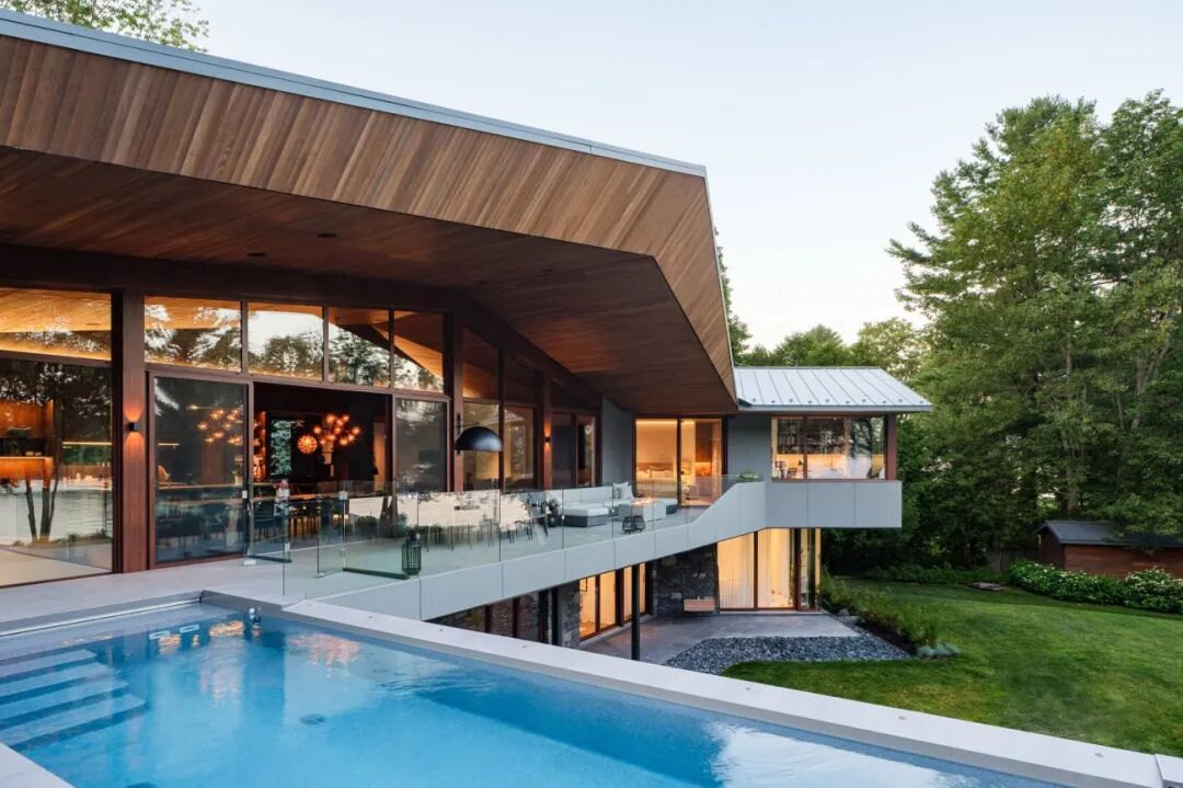 受鸟类动物展开翅膀造型的启发,该住宅拥有独特、起伏且具有建筑构思的屋顶,同时在结构上遵循其内部空间的体积。室内木质天花板由一系列不同高度的三角形构成——有些高度为25英尺——创造了独特而动态的空间。落地窗也遵循同样的角度。室内装饰、纹理和材料的和谐和丰富散发出温暖和独特的感觉。照明和机械系统被巧妙地整合在一起,隐藏在木质天花板中,几乎被隐藏起来了。在室外,屋顶向外突出14英尺,为魁北克省的严冬和盛夏提供了一定的防护。在住宅的水平轴上,一个线性露台从一端延伸到另一端,将主要室内空间(包括主起居区和主人宿舍)连接到公共室外空间和无边泳池,地面露台也是如此,因此,每个接入点以及室内和室外活动都能受到保护,免受各种因素的影响。住宅的设计方案、饰面、纹理和材料的选择以及细致的细节使其脱颖而出,同时与周围环境和谐相处。