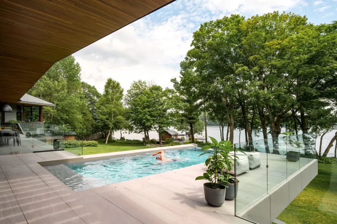 Owing to a real structural prowess, a reinforced concrete formwork allows the swimming pool to cantilever out 16-feet. A true extension of the main level terrace, the infinity pool terminates with a glass panel that creates the illusion of the pool extending well into the lake.The residual space between the load-bearing concrete walls serves as a mechanical room for pool systems, as well as storage space for outdoor furniture and other items.