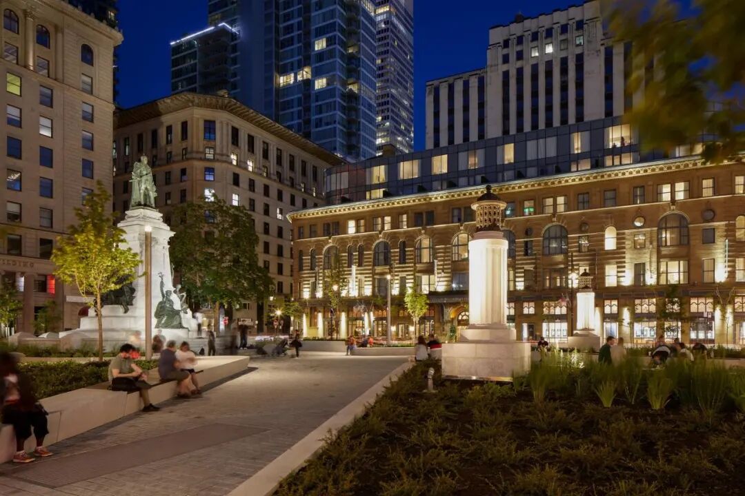 根据1841年菲利普斯计划的设想,该设计还将菲利普斯广场作为市中心核心的一个组成部分。该空间是对英国花园广场的当代诠释,由于更宽阔的人行道、茂盛的植物和开放的视线,提供了建筑环境和周围景观如画的风景,空间得到了新扩展。这座爱德华七世的纪念碑在1941年由亨利·伯克斯捐赠后建成,展示了新的向上照明,周围是集成的城市家具和可编程的水景。“我们在市中心创造了一个浪漫的绿洲,我希望Montréalers能拥抱这个重新参观的花园,它的阴影区域和它的水景,同时享受它的历史建筑的景色,”Sonia Gagné称,她是Provencher_Roy的主要合伙人和建筑师。
