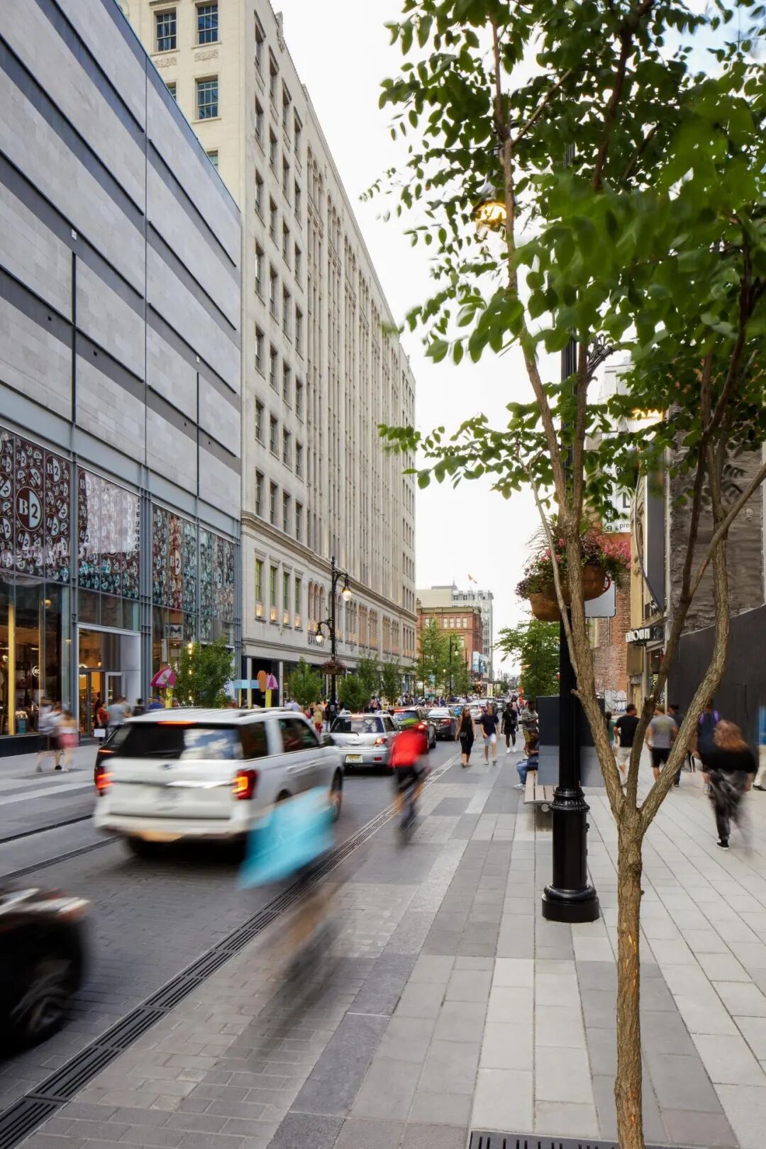 通过将一条四车道的道路改造成一条以行人为导向的道路,只有一条车道的汽车交通,重新设计创建了一条长廊,在De Bleury街和曼斯菲尔德街之间延伸了六个街区,汽车,骑自行车的人和行人共享道路。海滨长廊展示了沿途历史悠久的百货公司,并将该地区与周围环境融为一体。菲利普斯广场进行了扩建,为这座城市打造了一个新的绿色公共枢纽,这座城市的雄心是将Montréal转变为整个北美最环保、最绿色的城市中心。