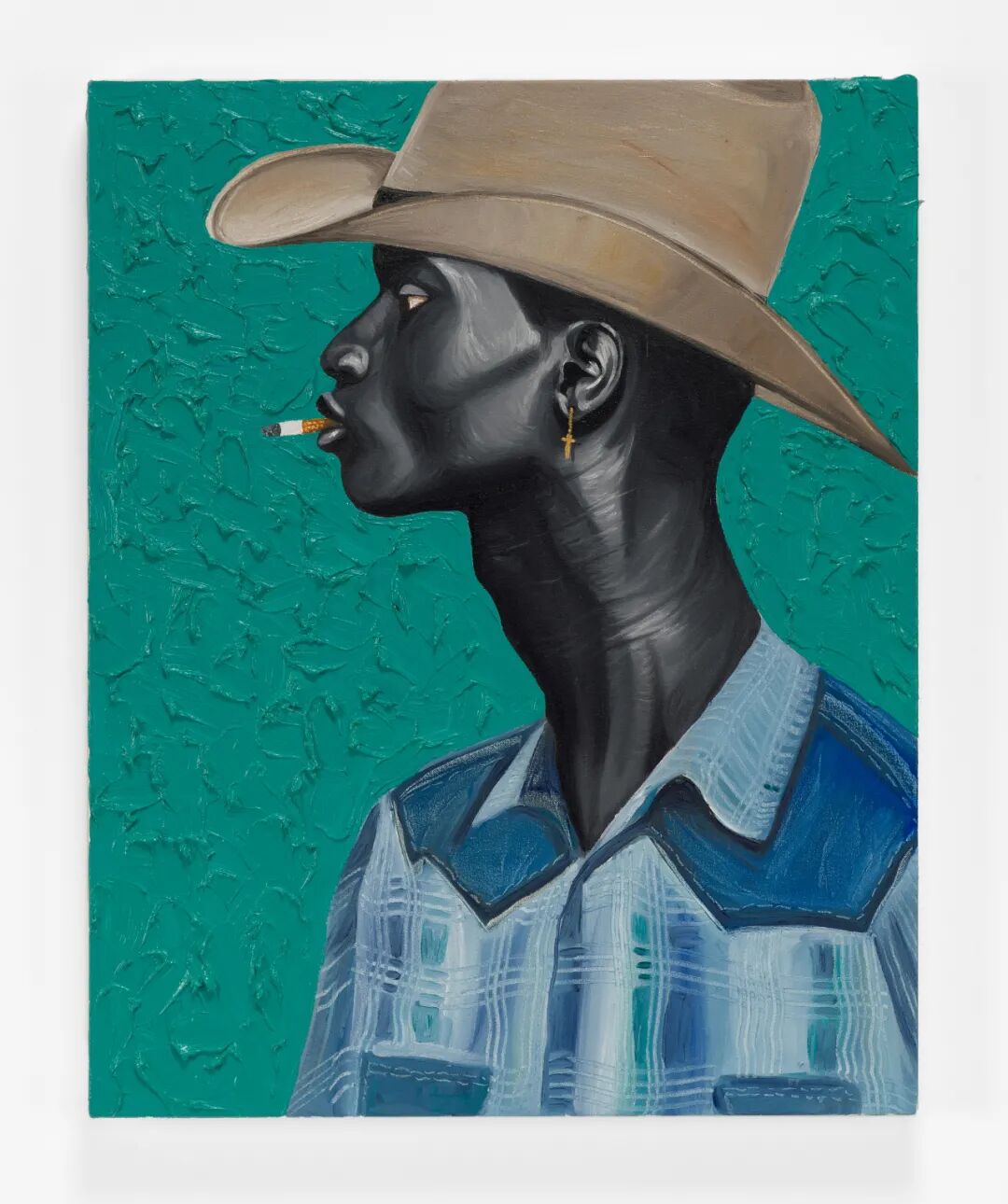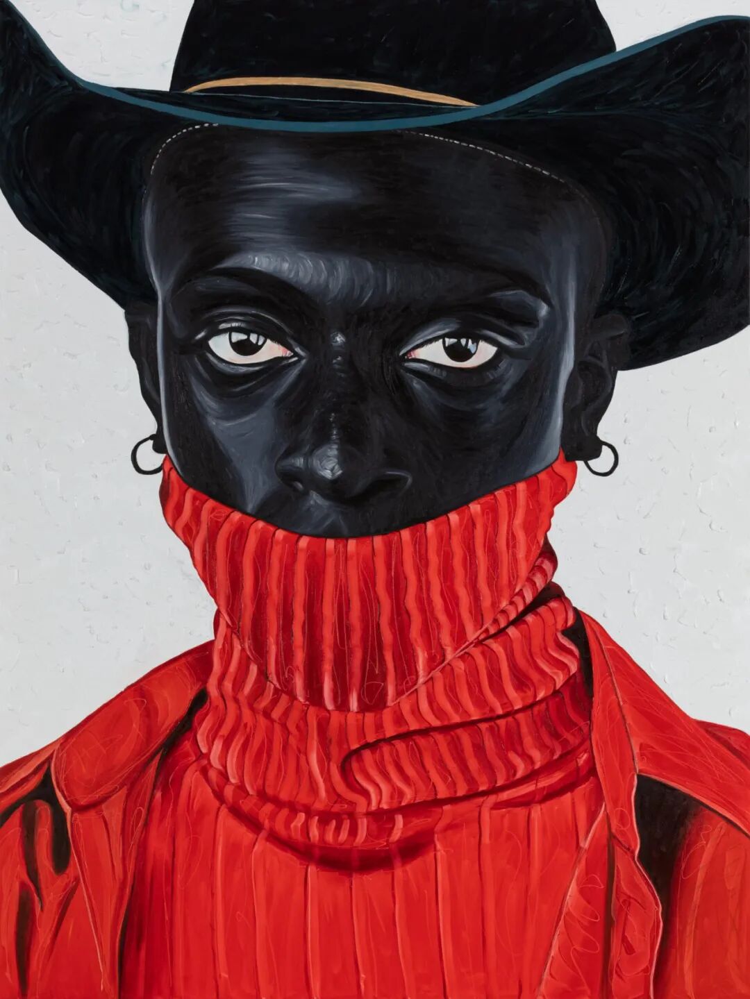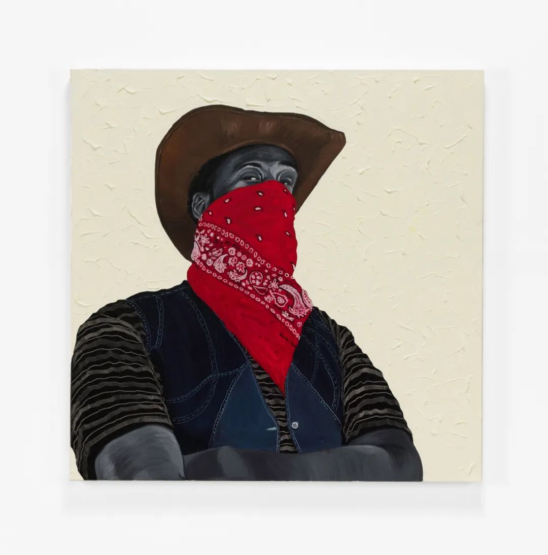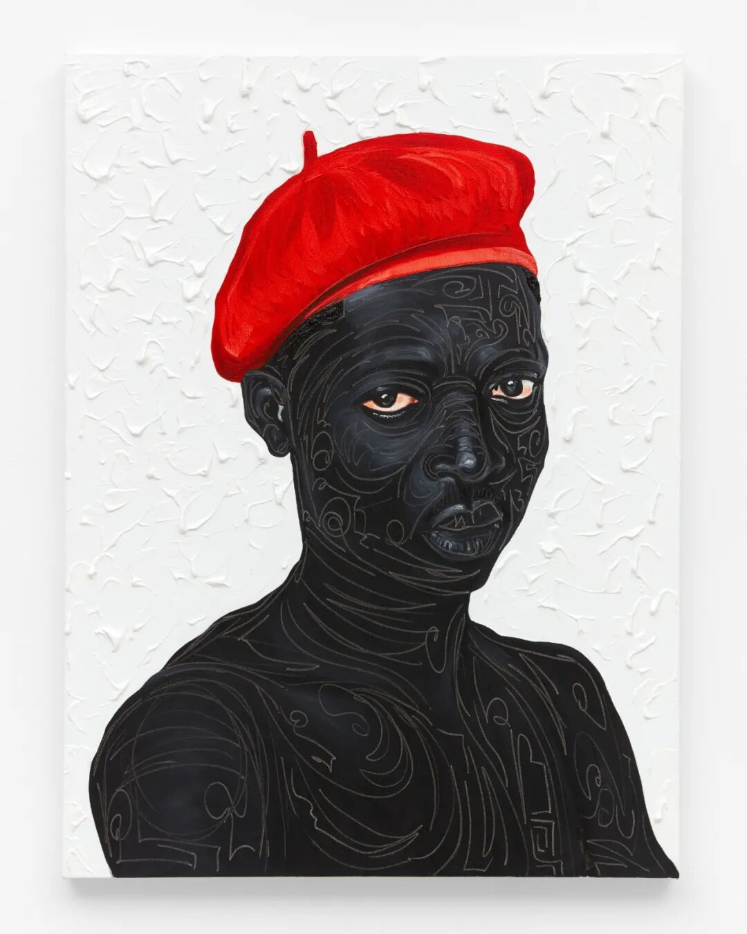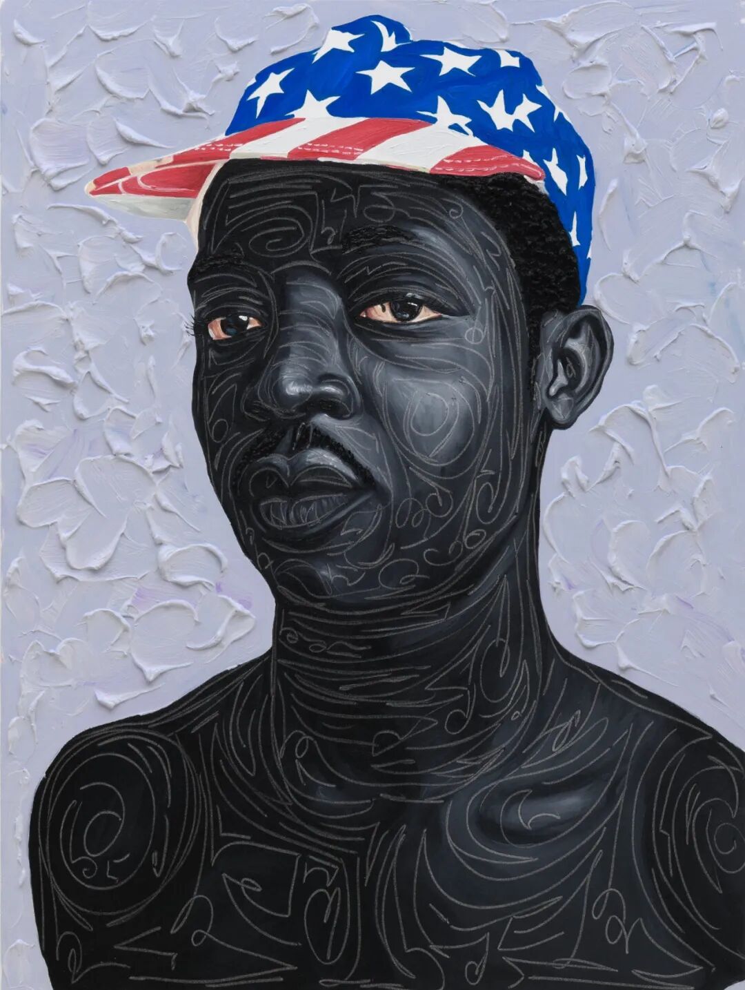 奎科目前是鲁贝尔博物馆的居民,在那里他创作了三件纪念美国牛仔的作品。“Rainyanni”、“Moses Adomah”和“David Theodore”,作品高 12 英尺,让人想起艺术家今年早些时候画的头巾佩戴人物。同样具有颠覆性的是“美国梦想家”,它以一个年轻的人物为中心——皮肤上覆盖着旋转的线条图案,这是艺术家最近的一些作品中反复出现的特征——他戴着一顶印有星星和条纹。