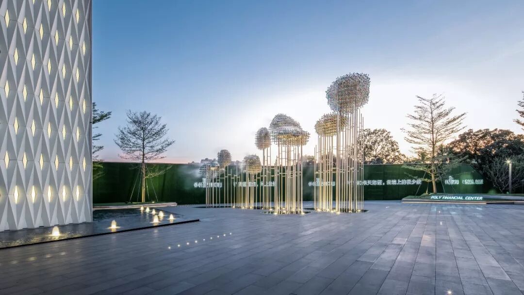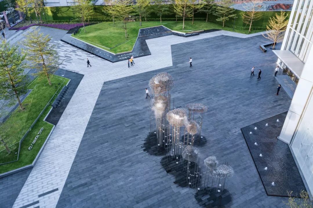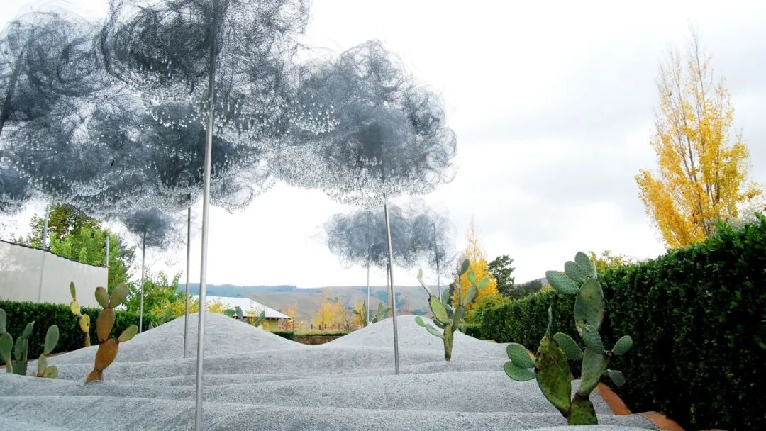 其打破了想象中云雾软绵柔和的虚无感,以硬朗的多重线条交叉层叠出大小不一、形状各异的云朵,但从云朵里释放出的缥缈梦幻的水雾又将云朵的特色展露无遗,更为铿锵有力的是从云端而降的飞瀑,虚空落泉千仞直,采用金属材质打造飞瀑直流而下的率直爽朗。