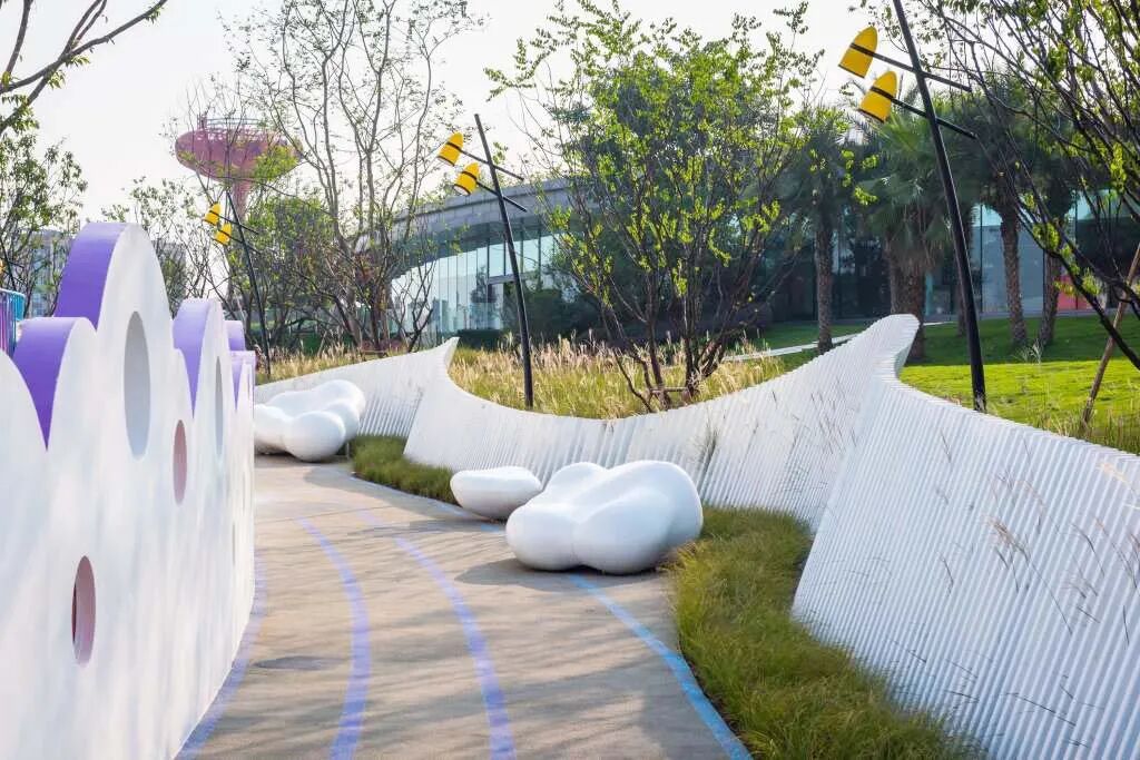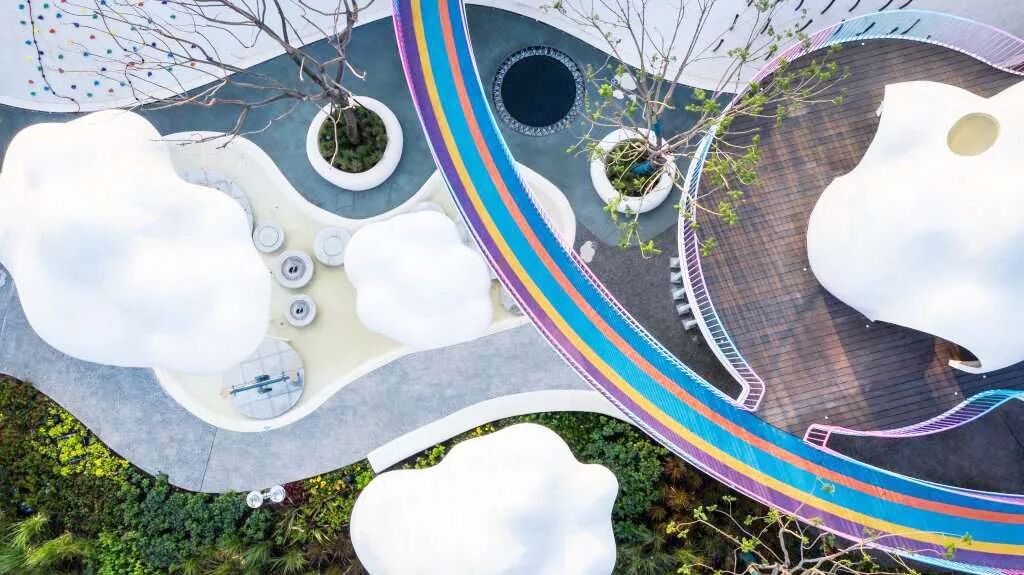 森林休憩园地通过起伏的地形表现森林地貌的多样性,结合七彩云朵 坐凳、云朵木桩、海绵蹦床,打造云间跳跃的梦幻休闲感。