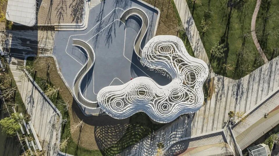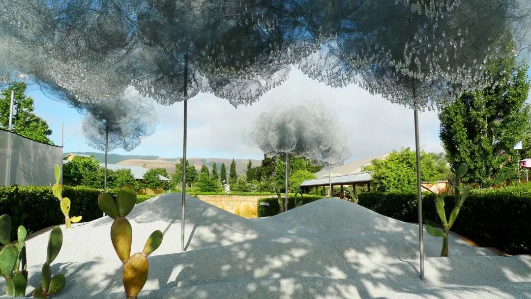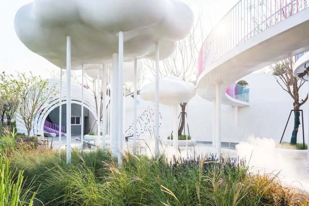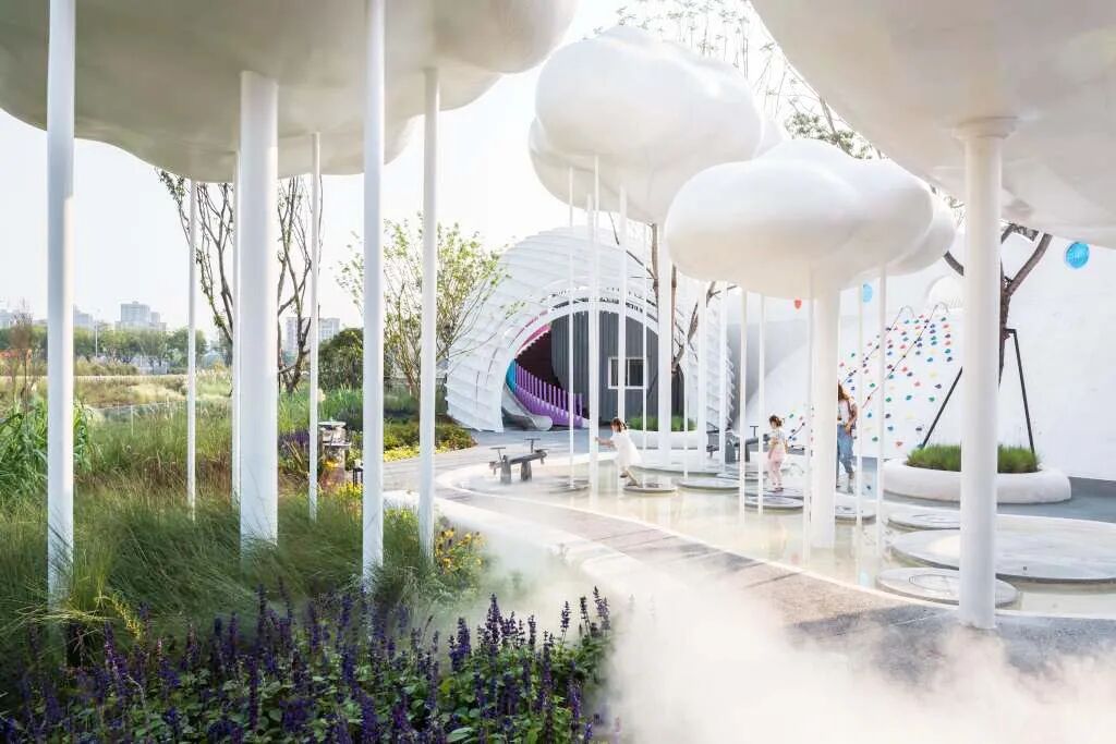 白云是由曹佩罗工作室以前的装置“摇篮曲花园”演变而来的,丝网漩涡由一系列细长的支柱支撑。
