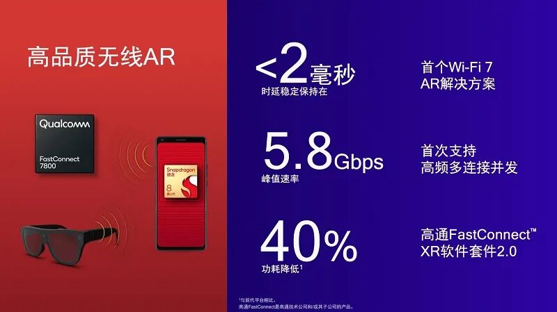 无线连接方面,骁龙AR2平台采用了高通FastConnect 7800芯片,能够完整的支持Wi-Fi 7的所有特性,实现了高频多连接并发技术,峰值传输速度可达5.8Gbps,延迟则降低至2毫秒以内,同时在功耗上也有所降低。高带宽、低延时,正是保证无线AR体验的关键因素之一。
