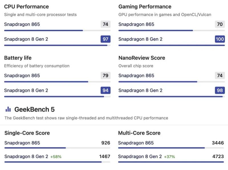 性能方面,骁龙AR2采用了分布式架构,自身可以分为AR处理器、协处理器和连接芯片三部分,此外还需配合第二代骁龙8移动平台进行使用。而骁龙XR2平台则是基于同时代的旗舰SoC骁龙865打造的XR专用平台,在制程工艺、处理器架构、CPU与GPU性能、TDP功耗等方面二者已经有了较大的差异,在跑分方面参考外媒的数据可以发现,提升幅度还是相当大的。