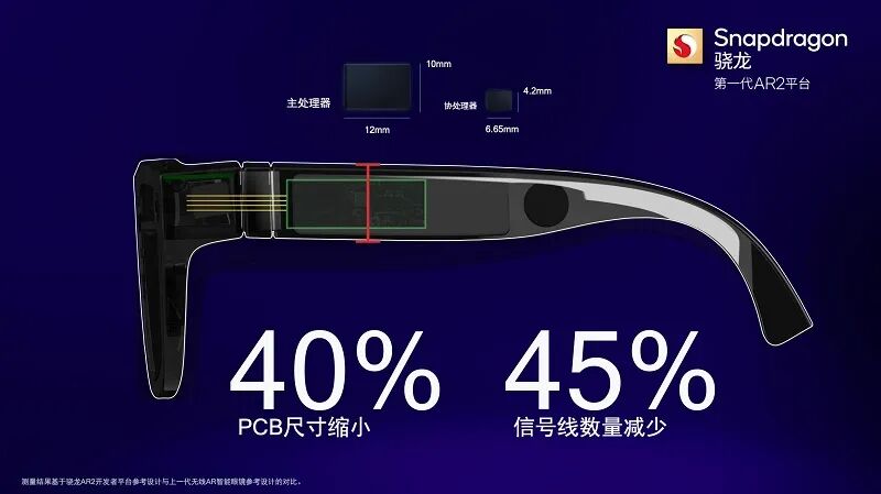最后,骁龙AR2创新性的分布式处理架构,在功耗上相比XR2降低了50%,PCB尺寸相比单处理器设计减少40%,让AR眼镜在变得更加小巧轻便的同时,还能够拥有更长的续航时间。