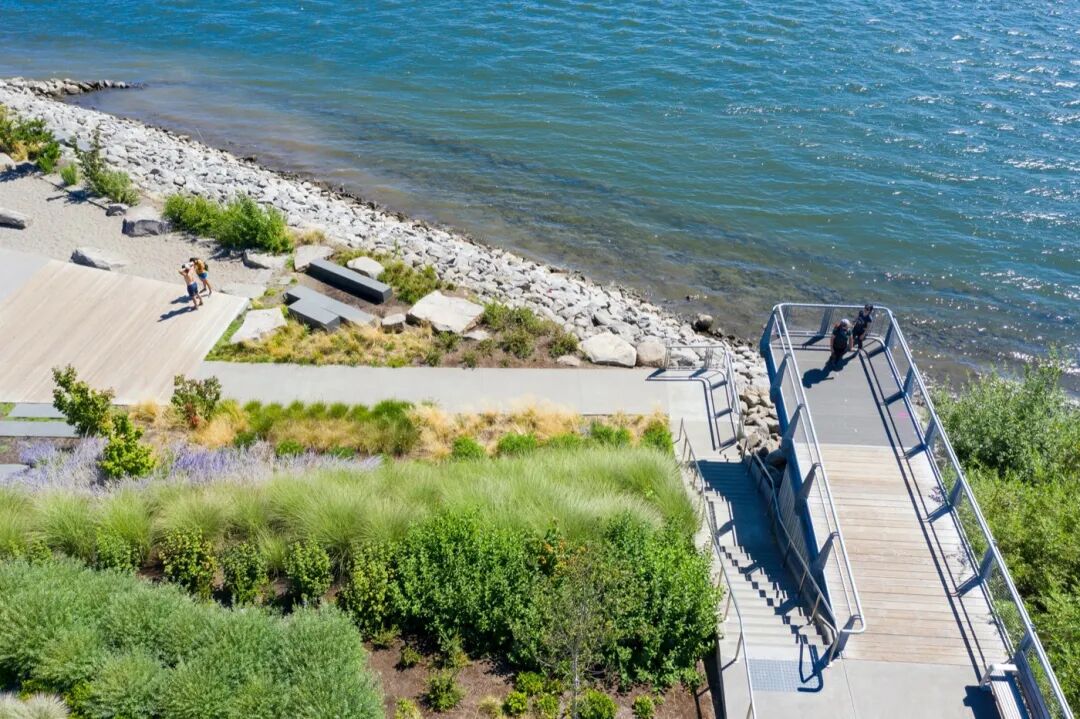 从海岸线到街道边缘的小径缠绕和编织,模仿水的流动;河流的表现形式出现在铺路图案中,并引导游客前往格兰特街脚下的悬臂式码头。公共艺术家团队和景观设计师之间的紧密合作过程产生了一种无法区分艺术和景观的设计。