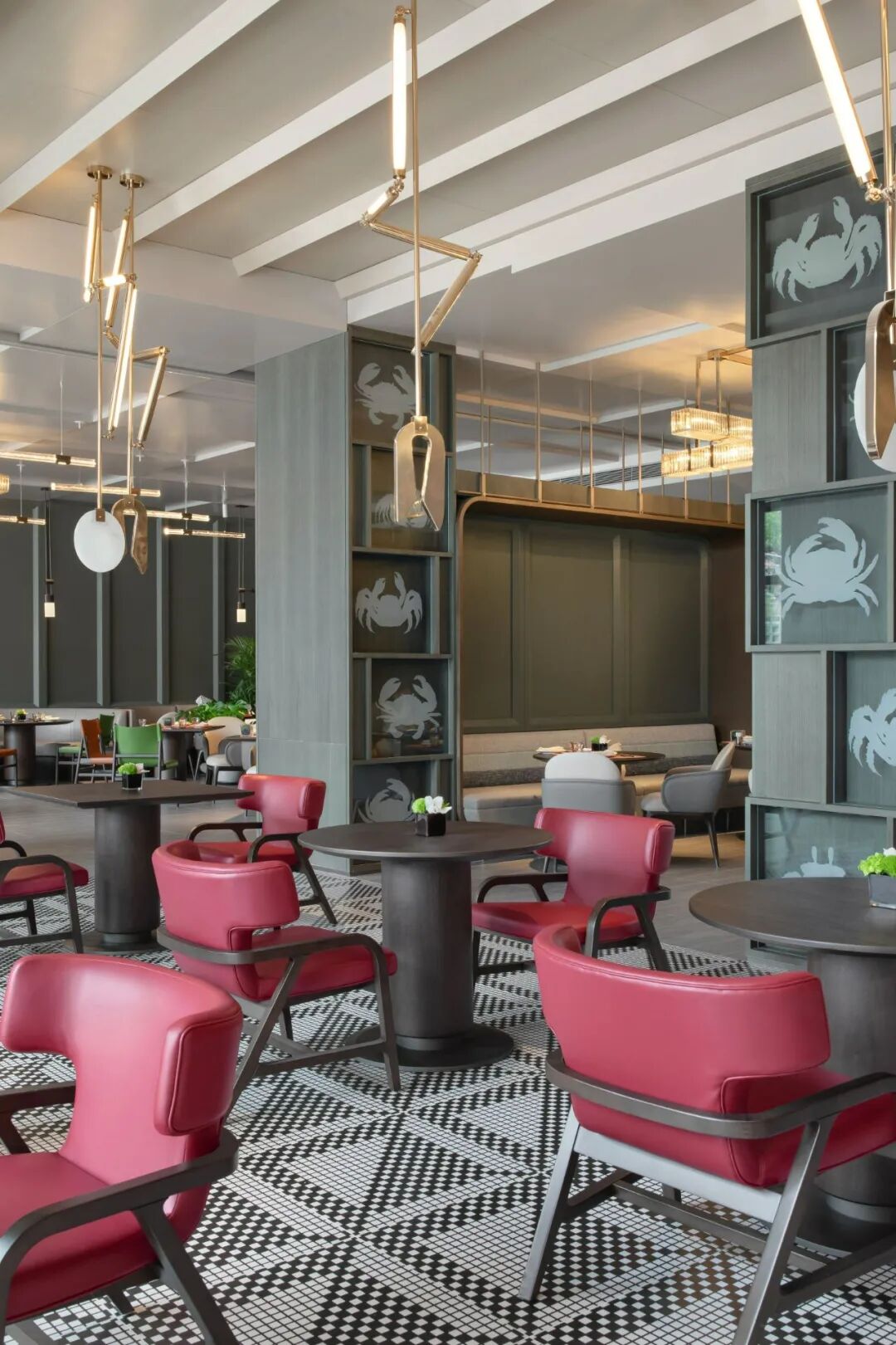 挑高的大堂以深木色为主调,屏风层层叠进,带有庄严的阵列感,稳重而雅致。入口与尽端的亚克力山朦胧迷幻,似雨后忽远忽近的山峰。地面水纹石材顺着海的方向延续到墙面,将中山平原广布、丘陵点缀、河网密集的地貌微缩到大堂室内。