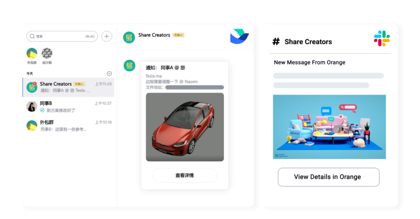 在日常沟通方面,Share Creators支持常用沟通工具的集成,像飞书、钉钉、企业微信、Slack等沟通工具都可以通过API集成到Share Creators中。这样就可以轻松导入整个公司的组织人员,如果人员离职了只在通讯工具里删除就可以,资产的访问权限就自动关闭了,不用再两边管理用户名单。
