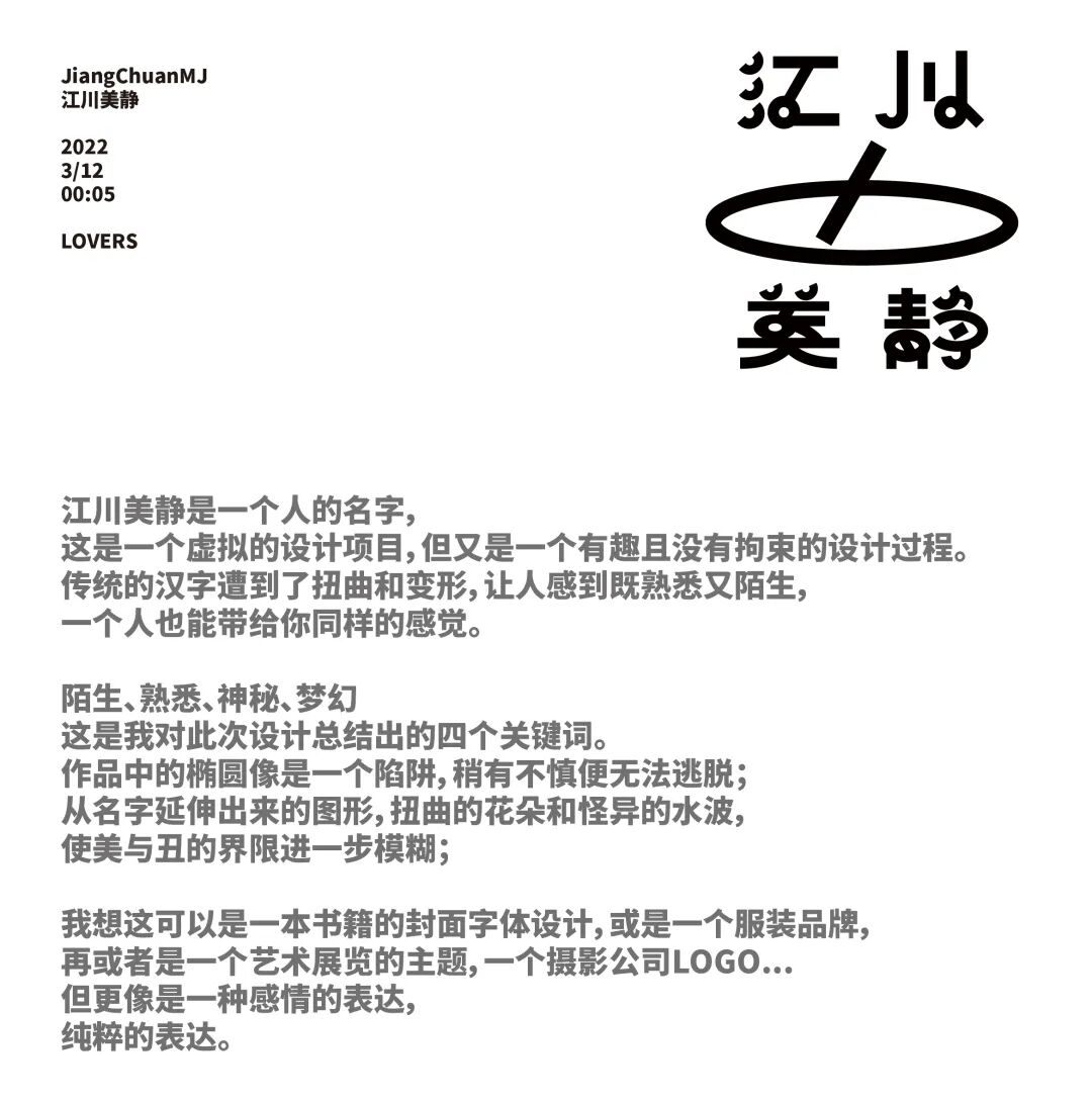 江川美静是一个人的名字,这是一个虚拟的设计项目,但又是一个有趣且没有拘束的设计过程。传统的汉字遭到了扭曲和变形,让人感到既熟悉又陌生,一个人也能带给你同样的感觉。