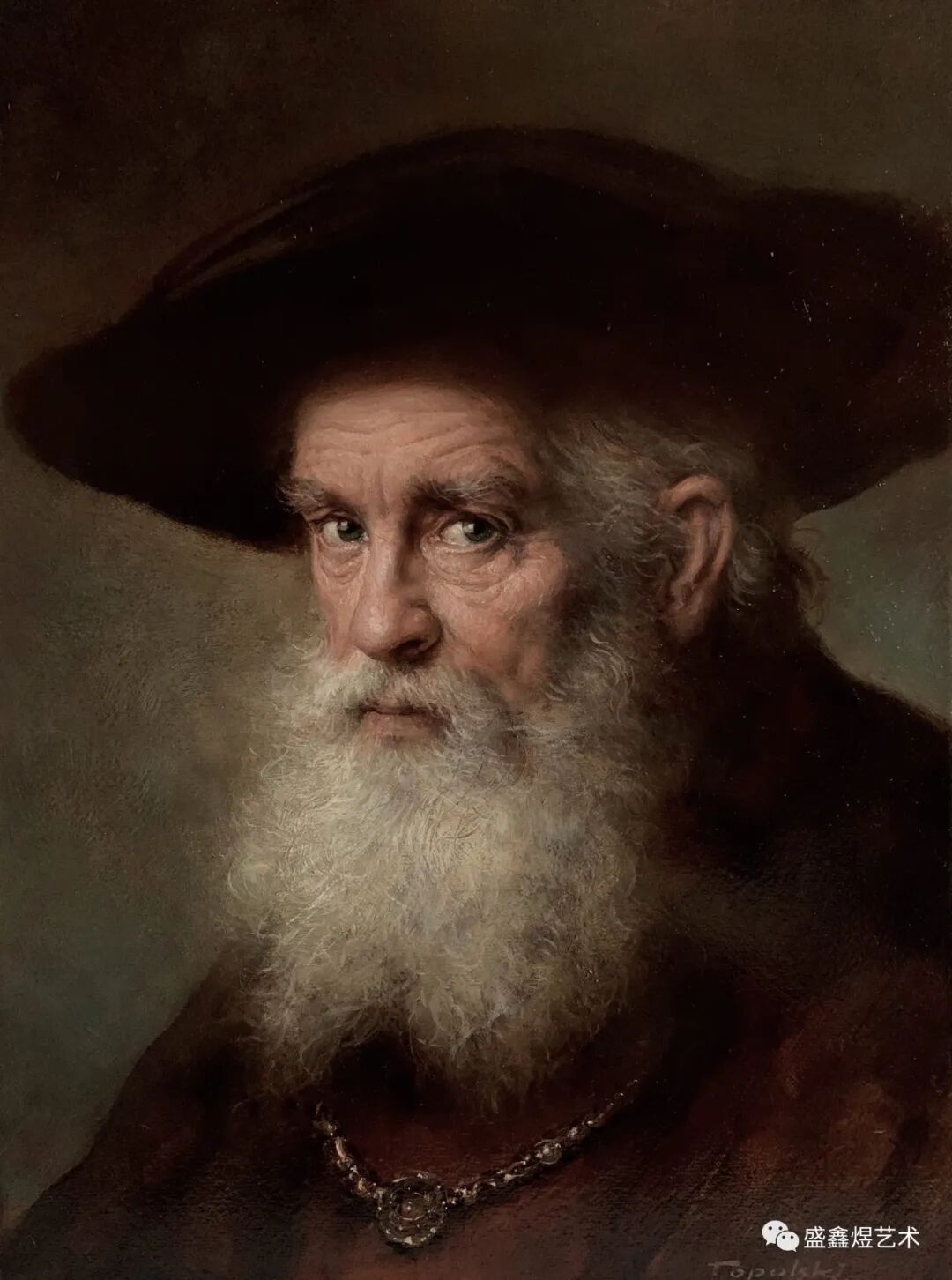 彼得·托波斯基在他的作品中纪念了许多伟大的人,画笔下的人物眼睛闪闪发光,仿佛他们还活着。艺术家采用布面油画的方法。他的艺术以细致的观察和对光线和色彩的非凡敏感性而著称。他在阴暗的背景下自由地描绘老年人的有趣形象,带出生活的深刻美和挑战。他曾为世界各地的艺术收藏家私人收藏作画。