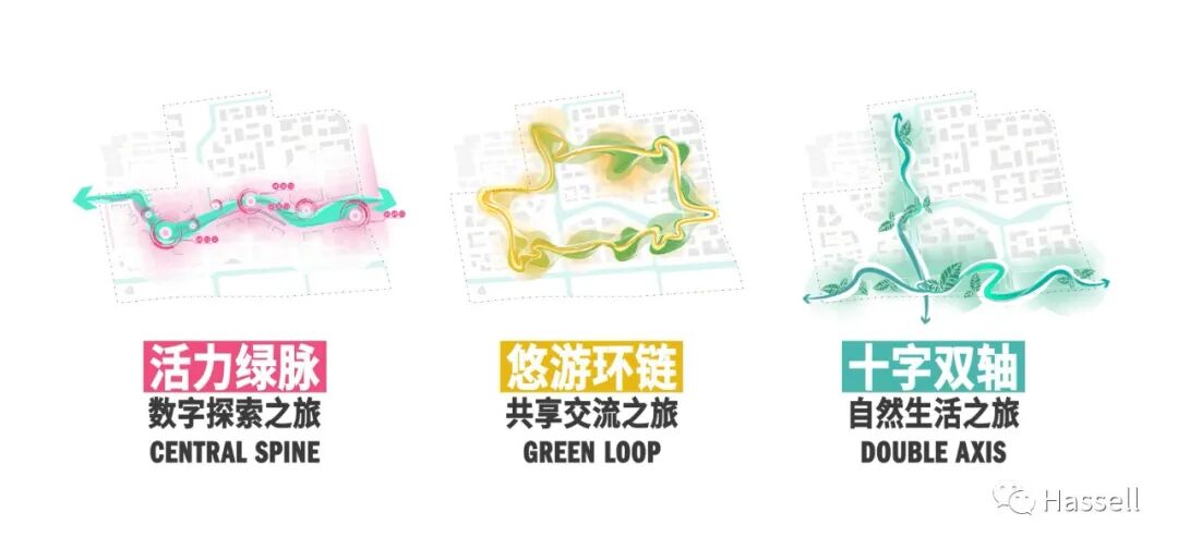 Hassell提出产城公园的开发理念,区别于传统产业园区的城市核心绿地,“蕴绿”策略延续了场地原有的生态环境,借助流线型设计语言,将动线如植物的脉络一般延伸至整个场地,“脉动”各个城市节点,成为促进数字化国际产业城区建设的催化剂。近期先行开发公共绿地激活园区城市活力,吸引周边居民,打造城市目的地。以活力绿脉、悠游环链、十字双轴的发展框架来布局数字江海的空间功能。