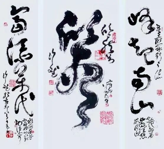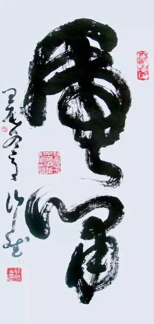 看看这位所谓的“伟大的书圣、印圣”的作品,一眼便知是典型的江湖书法,没有传统书法的影子,任笔为体、下笔无法,一味地缠绕环转,书法的内涵与神采不见一点踪影,胀满眼睛的尽是虚张声势的不安与狂躁。无知者无畏,大抵就是指这样的人。
