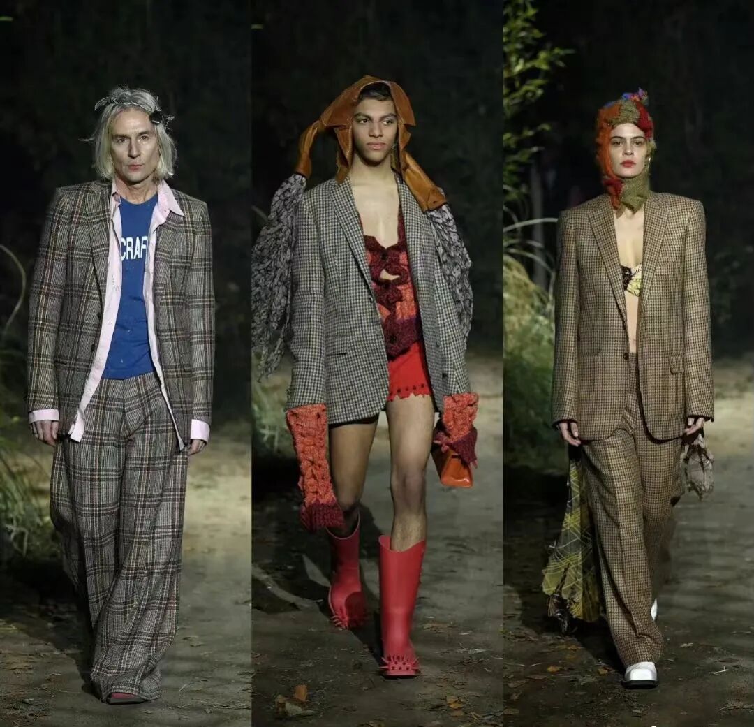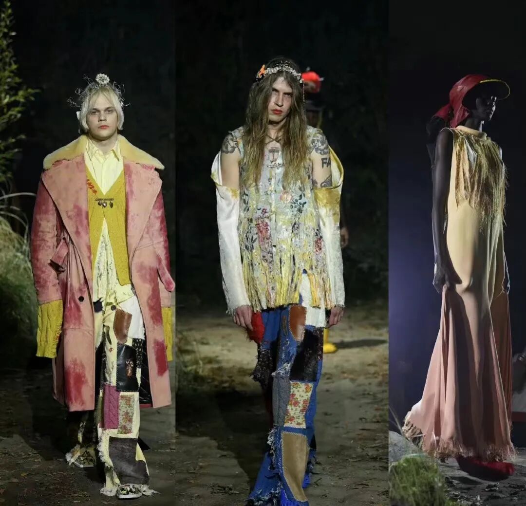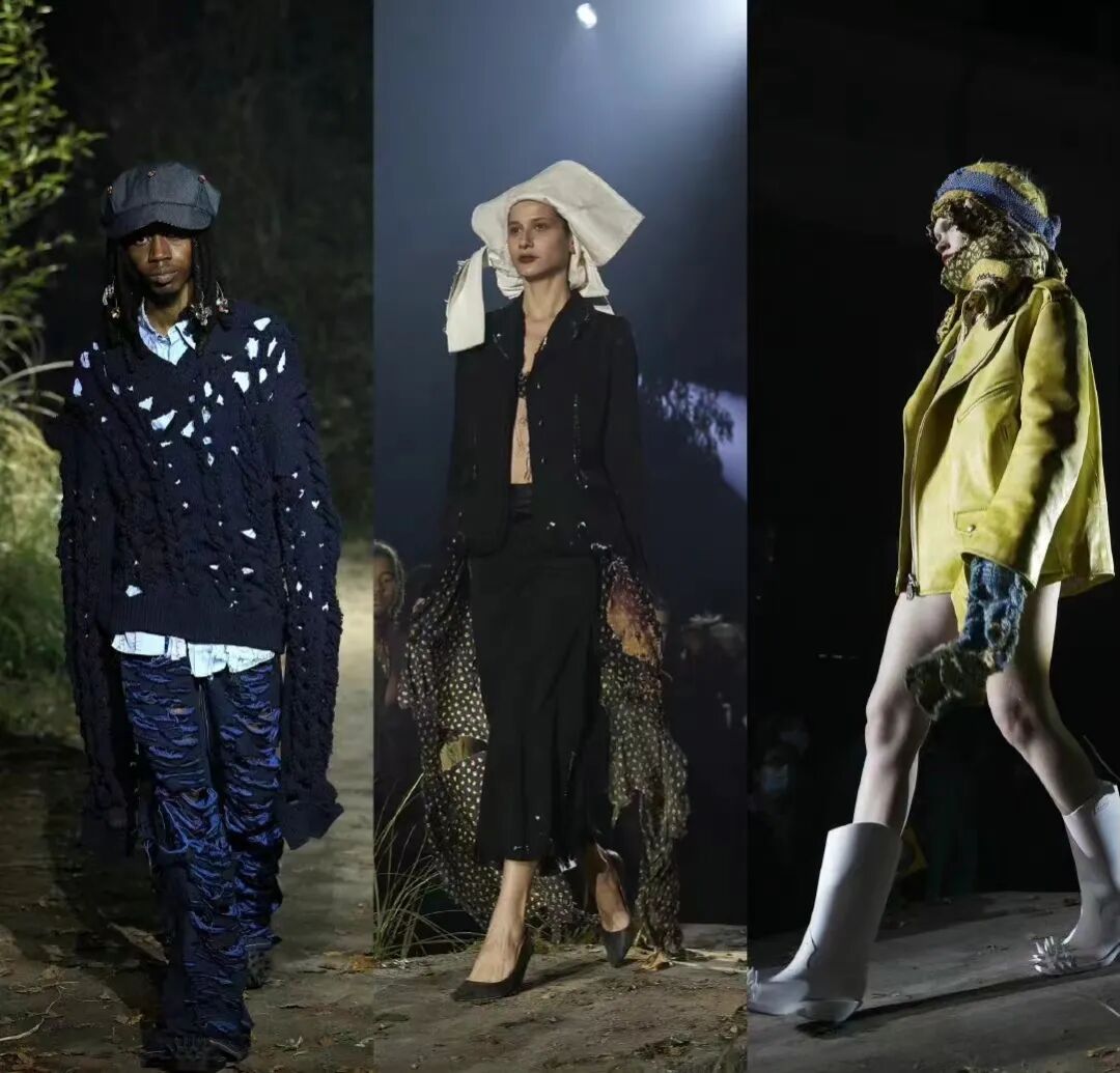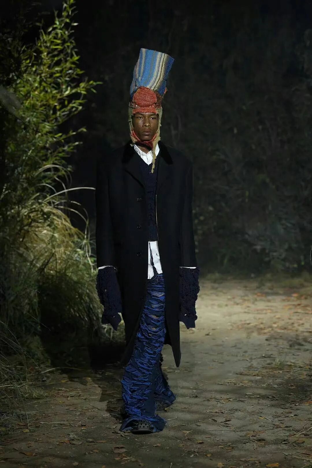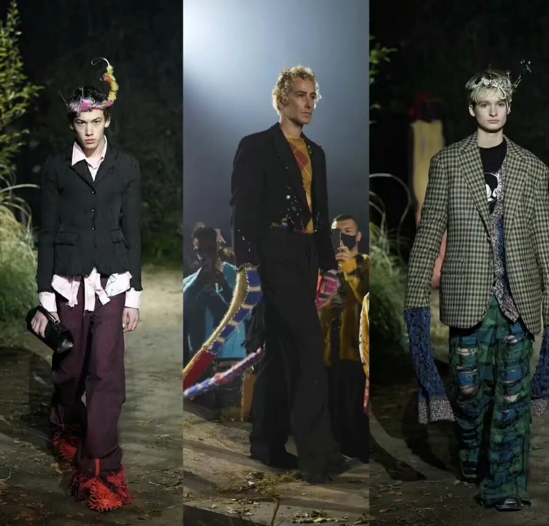 Francesco Risso将破碎、磨边、做旧、染色、拼接等手法融入其中,那些看似随意撕裂的服装自然随性,以及模特头上的配饰也稀奇古怪,无论是设计还是秀场设定,都有一种回归原始的感觉。