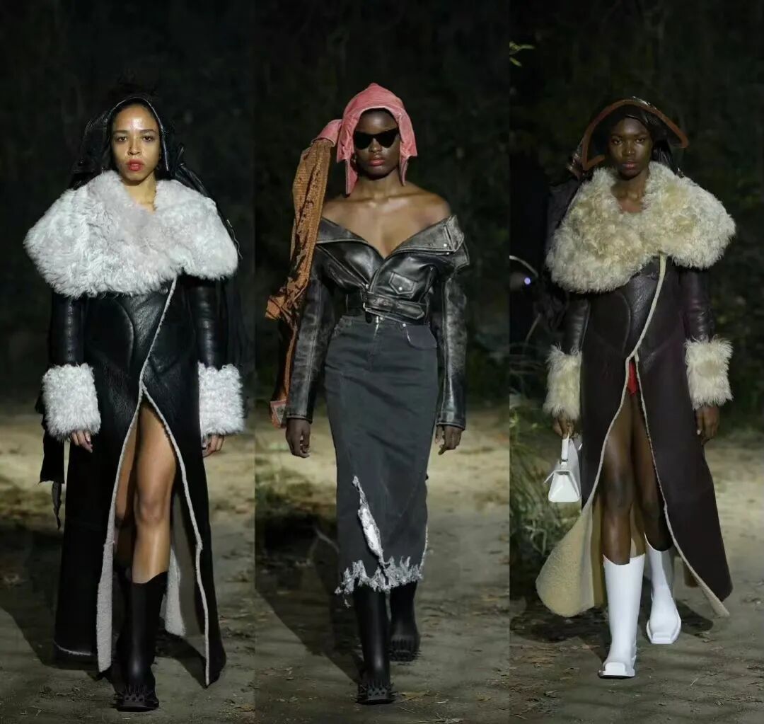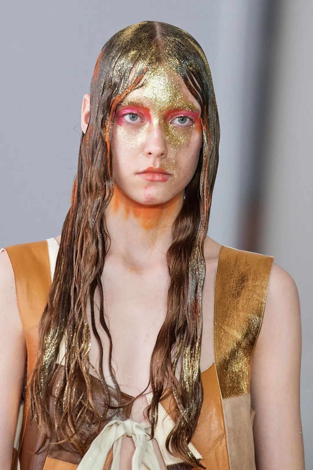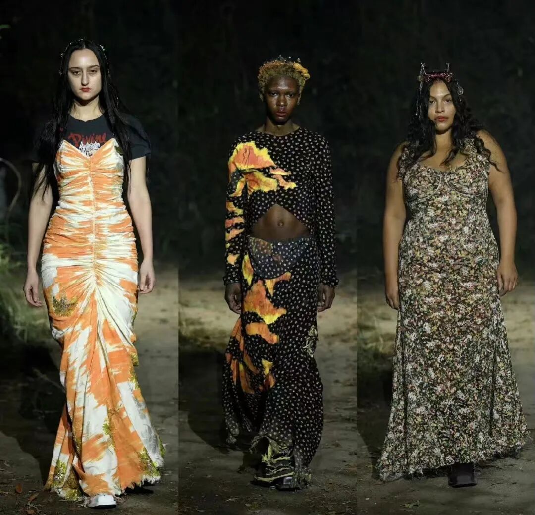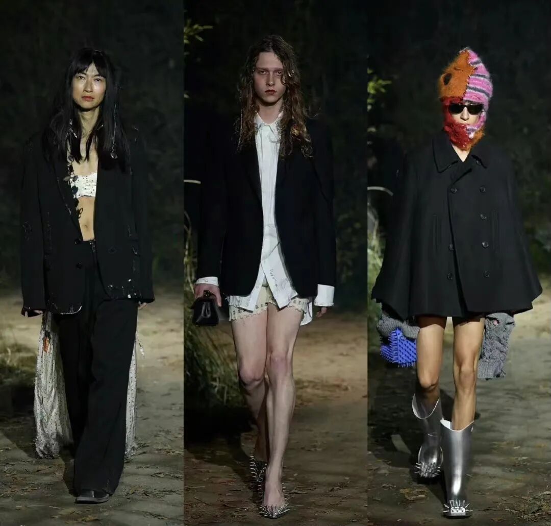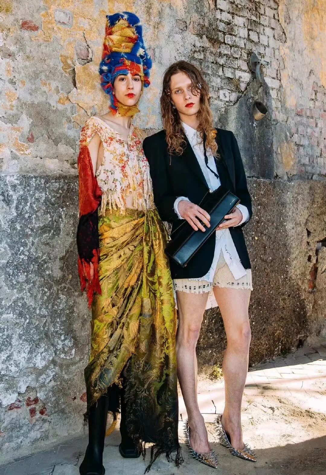 Francesco Risso将破碎、磨边、做旧、染色、拼接等手法融入其中,那些看似随意撕裂的服装自然随性,以及模特头上的配饰也稀奇古怪,无论是设计还是秀场设定,都有一种回归原始的感觉。