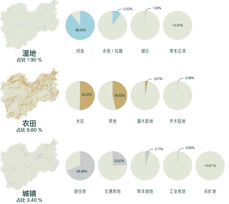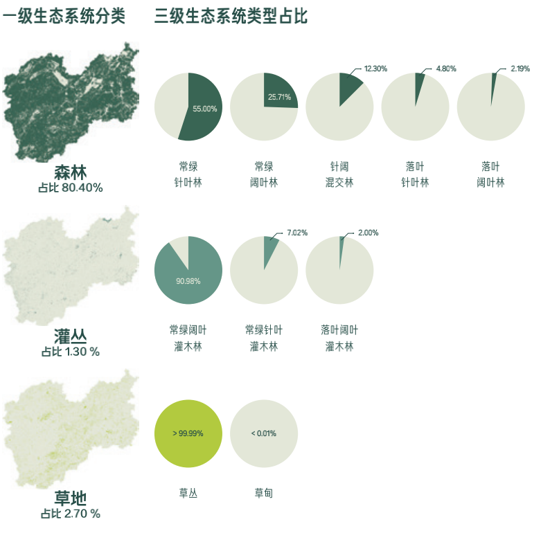 81.7%的森林覆盖率,不足以代表丽水极致的自然生态,湿地、草地、灌丛...多样的自然生态系统造就了丽水“自然中的城市”。自然生态系统占据了全市域面积高达86.8%,而人工生态系统则主要为农田和城镇生态系统,仅占市域面积的13.2%。