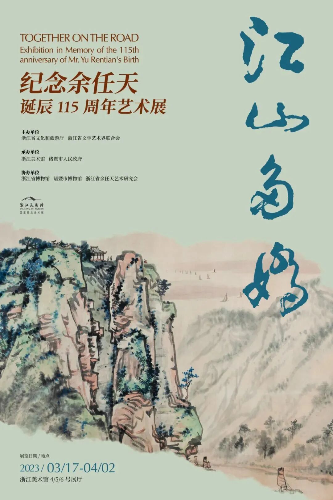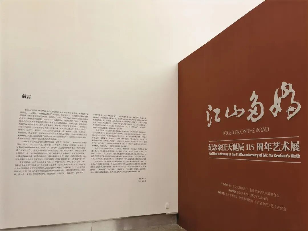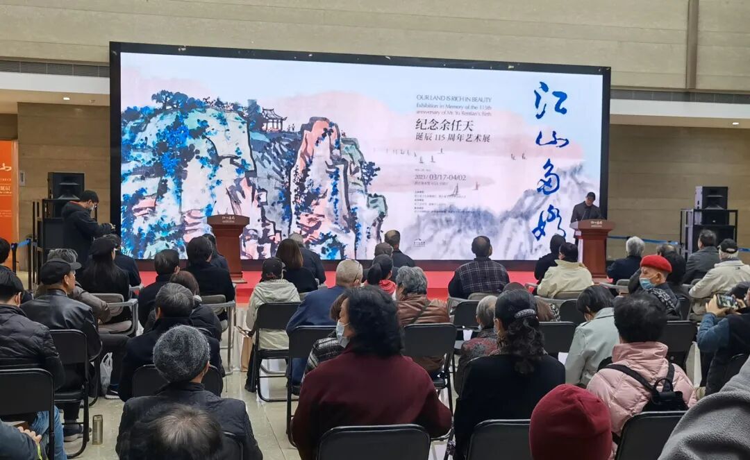 由浙江省文化和旅游厅、浙江省文学艺术界联合会主办,浙江美术馆、诸暨市人民政府承办,浙江博物馆、诸暨市博物馆、浙江省余任天艺术研究会协办的“江山多娇——纪念余任天诞辰115周年艺术展”3月17日下午在浙江美术馆“春风拂面”地光彩开幕。展览遴选余任天作品160余件,分为“氤氲缱绻”“逶迤磅礴”“金石雄健”“乾坤清气”“云山苍苍”等板块,包含绘画、书法、篆刻和诗稿等内容,较为全面反映余任天诸多领域的上下求索。其中1962年绘制,悬挂北京人民大会堂达35年的丈二匹大画《富春江严陵濑钓台》第一次和家乡人民见面,这是目前所能看到余任天“强其骨”的最大山水画。