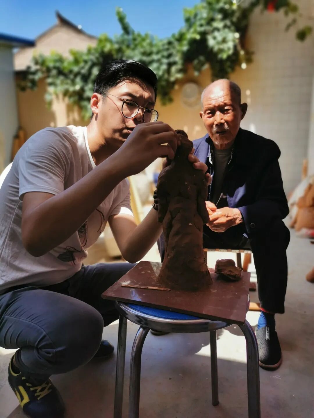 答:儿子在学校念个两下书,小学毕业以后,因为家庭困难就跟父母学习,他学的话主要赶十来岁了,他主要劳动学做这个泥塑,是主要人员。
