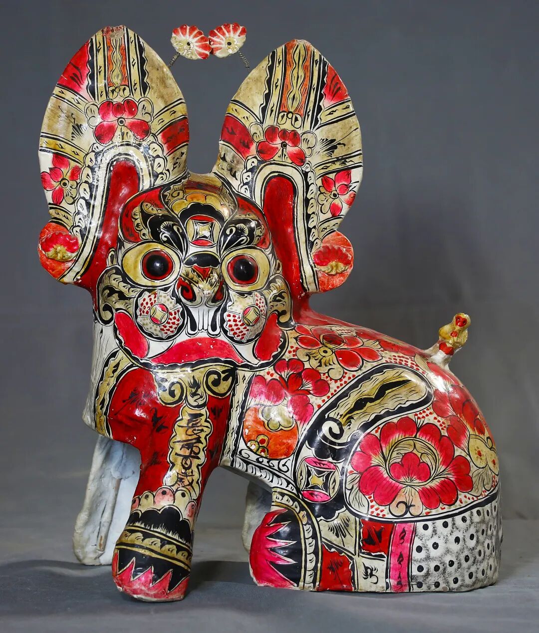 传统的泥老虎是坐着的,很憨厚的样子。这是因为作为孩子的守护神,它首先得坐得住,和孩子的一生长相厮守。憨厚的形象很家居,完全没有西府其他兽面民间工艺的狞厉,因为它的伙伴是孩子,不能太凶。泥老虎红绿的色彩和繁复的图案,几乎集中了人间所有美好的祝愿,红色代表霸气,绿色象征活力;耳朵上的寿桃寓意长寿,脸蛋上的牡丹显示高贵,尾巴上还有一个铜钱,带来的当然是富足。随着艺人丰富的想象,泥老虎的身体上也布满了各种寓意美好的花草,但绝对都是二三月开的花,超过八月的花没有。