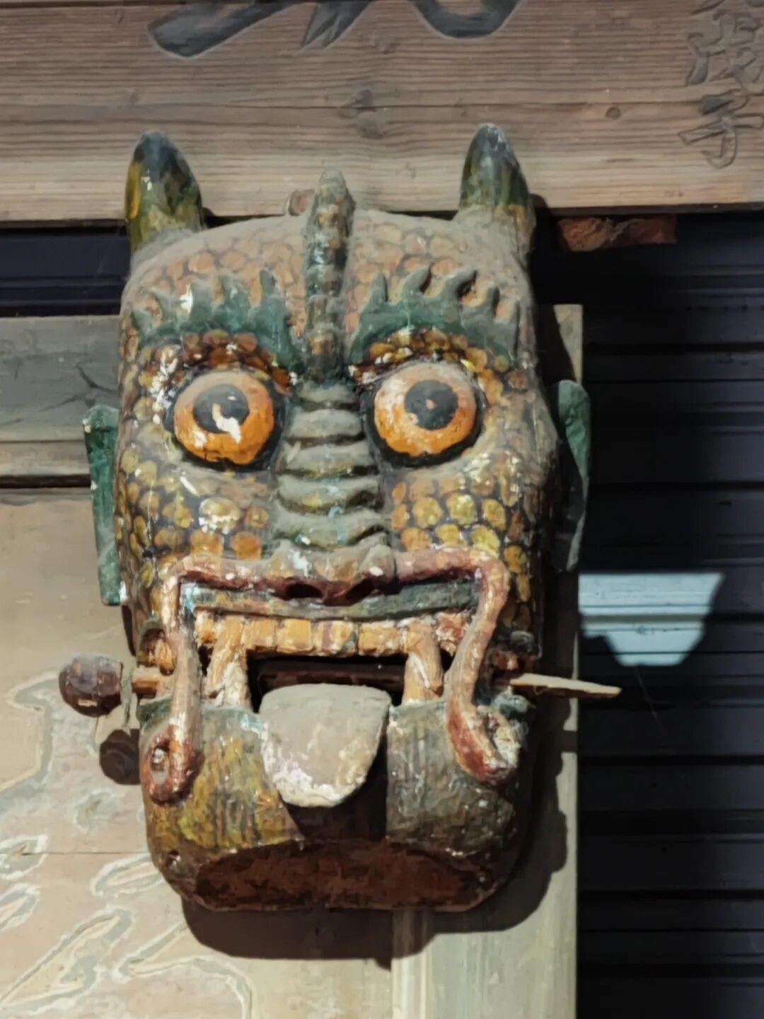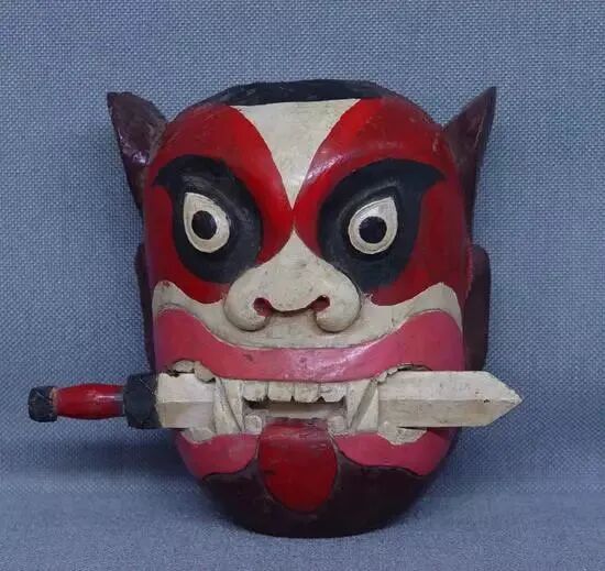 吞口是民间面具的一种特殊表现形式,与面具不同的是吞口不能戴在脸上,因此它的开光仪式与傩面也不尽相同。但相似之处在于吞口也起源于原始巫傩文化,是图腾崇拜与与巫文化结合的产物。从现存吞口形象来看大多为兽,且面相狰狞、豹眼怒视,好似能抵挡一切邪秽灾害,其意在保佑家庭平平安安、风调雨顺。吞口一般雕刻在石柱之上立在道路两旁,或彩绘于门楣之上,也有纸上画吞口贴于门楣之上,形式不一。吞口多见于云、贵、川、湘、陇等地区,当然,在汉族生活地区也有不少留存,比如闽南剑狮。