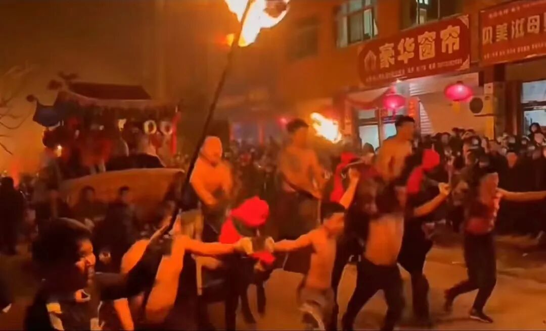 ▲云南石林县大糯黑村的男子在祈祷人畜兴旺、五谷丰登的祭祀日里戴吞口面具载歌载舞