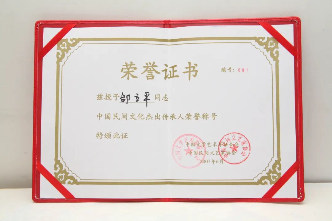 邰立平中国杰出非物质文化遗产传承人证书