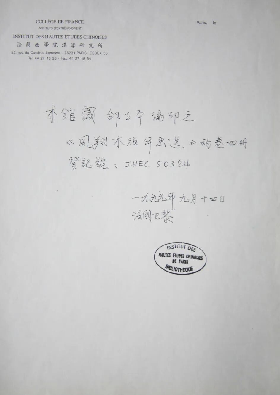 邰立平木版年画法兰西学院收藏证