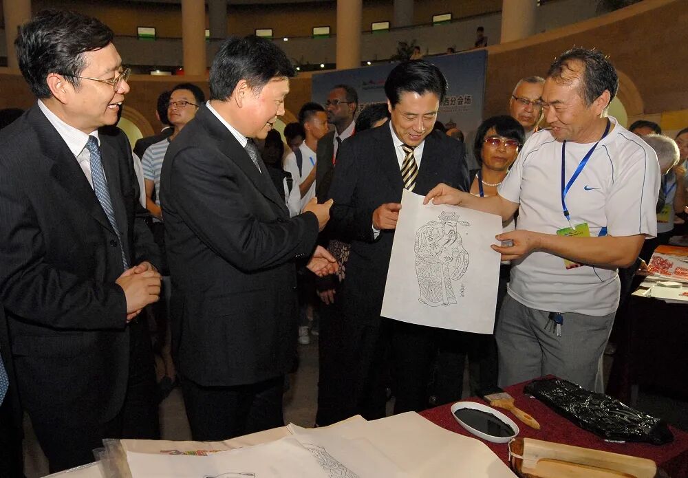 图片自左往右依次为陕西省副省长白阿莹、陕西省省长娄勤俭、文化部副部长董伟、国家非遗传承人邰立平