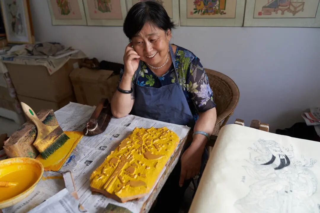 邰立平的妻子王惠芳在印制年画间隙