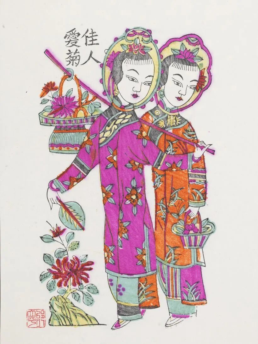 (左)佳人爱菊 木版水印 高45cm 宽35cm 宣纸