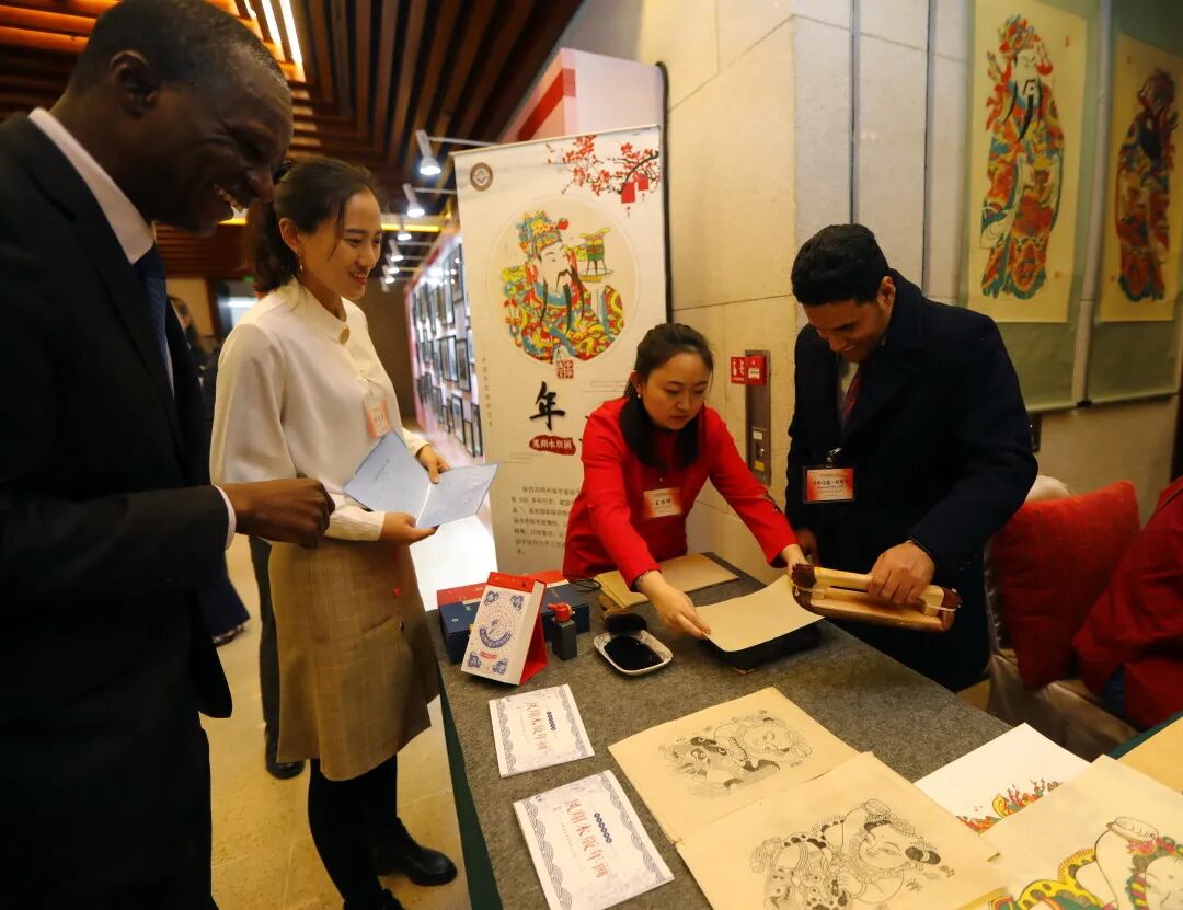 2020年,邰立平的儿媳王怡璇在国家新闻办新年招待会上指导多国嘉宾体验年画印制技艺