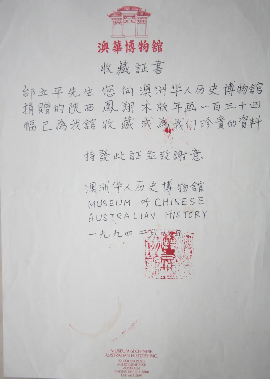 邰立平年画澳华博物馆收藏证