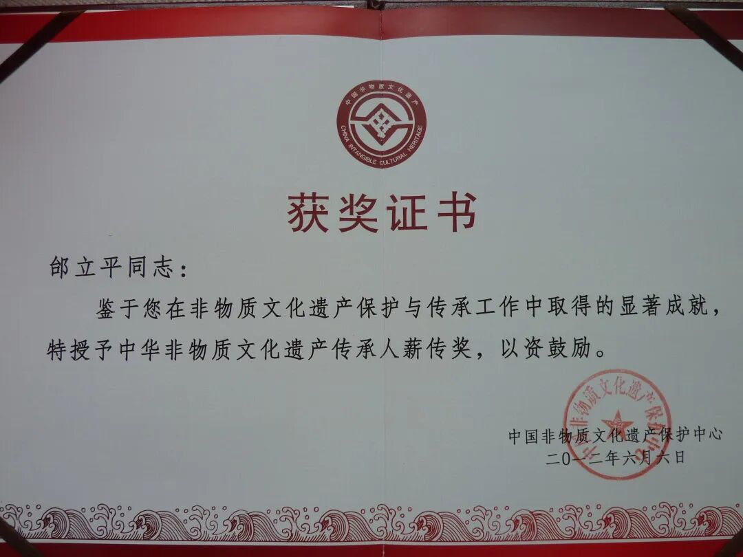 邰立平中华非物质文化遗产传承人薪传奖证书