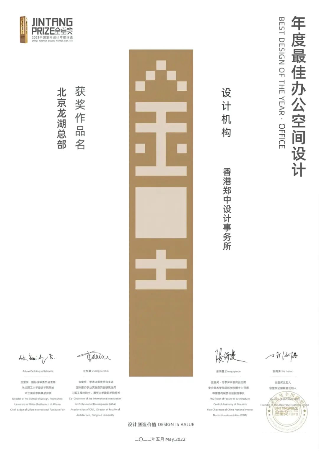 2010年,金堂奖诞生,正式提出“设计创造价值”的主题,“为百万设计师呐喊、向千万业主传播”的使命,发出“公益、公正、独立、服务”的金堂奖宣言。
